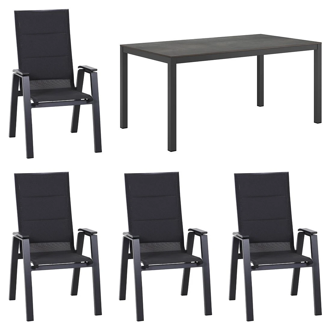 Eine ausgesprochen schöne Optik bietet Ihnen die Oberfläche des im Set enthaltenen Tisches aus HPL. Diese in Zement Dunkel gehaltene Tischplatte ist zusätzlich beständig gegen Frost und Hitze bis maximal 180 °C. Klassisch aus vier Tischbeinen besteht das Gestell des Tisches. Die rechteckige Form ermöglicht es Ihnen, den Tisch in Ecken und an Häuserwänden platzsparend einzusetzen.