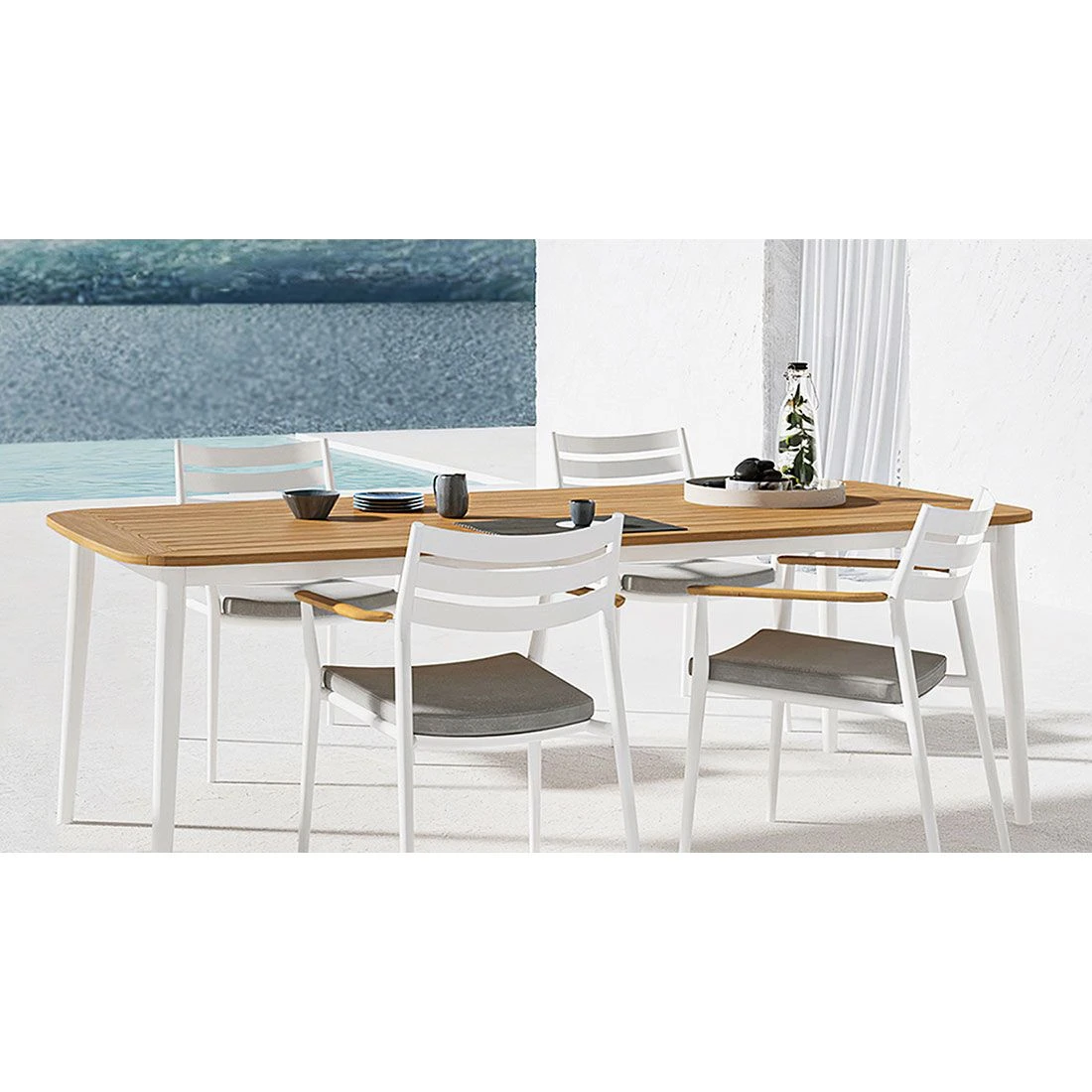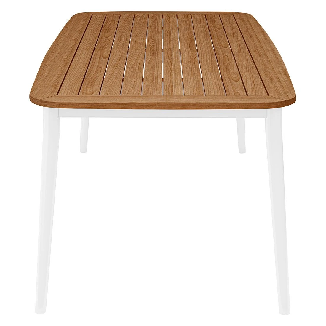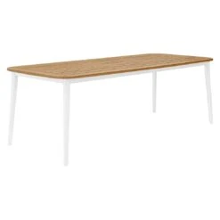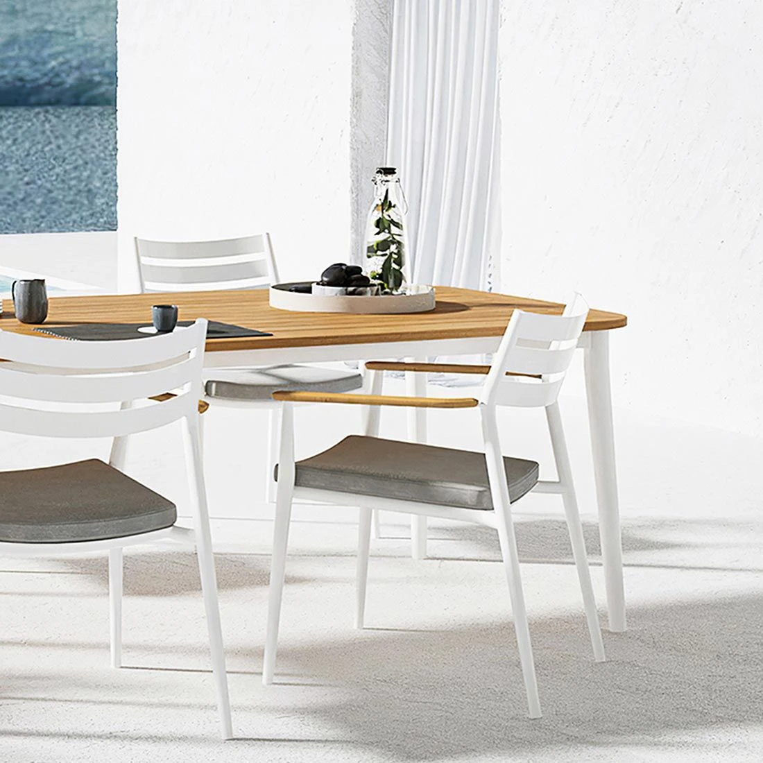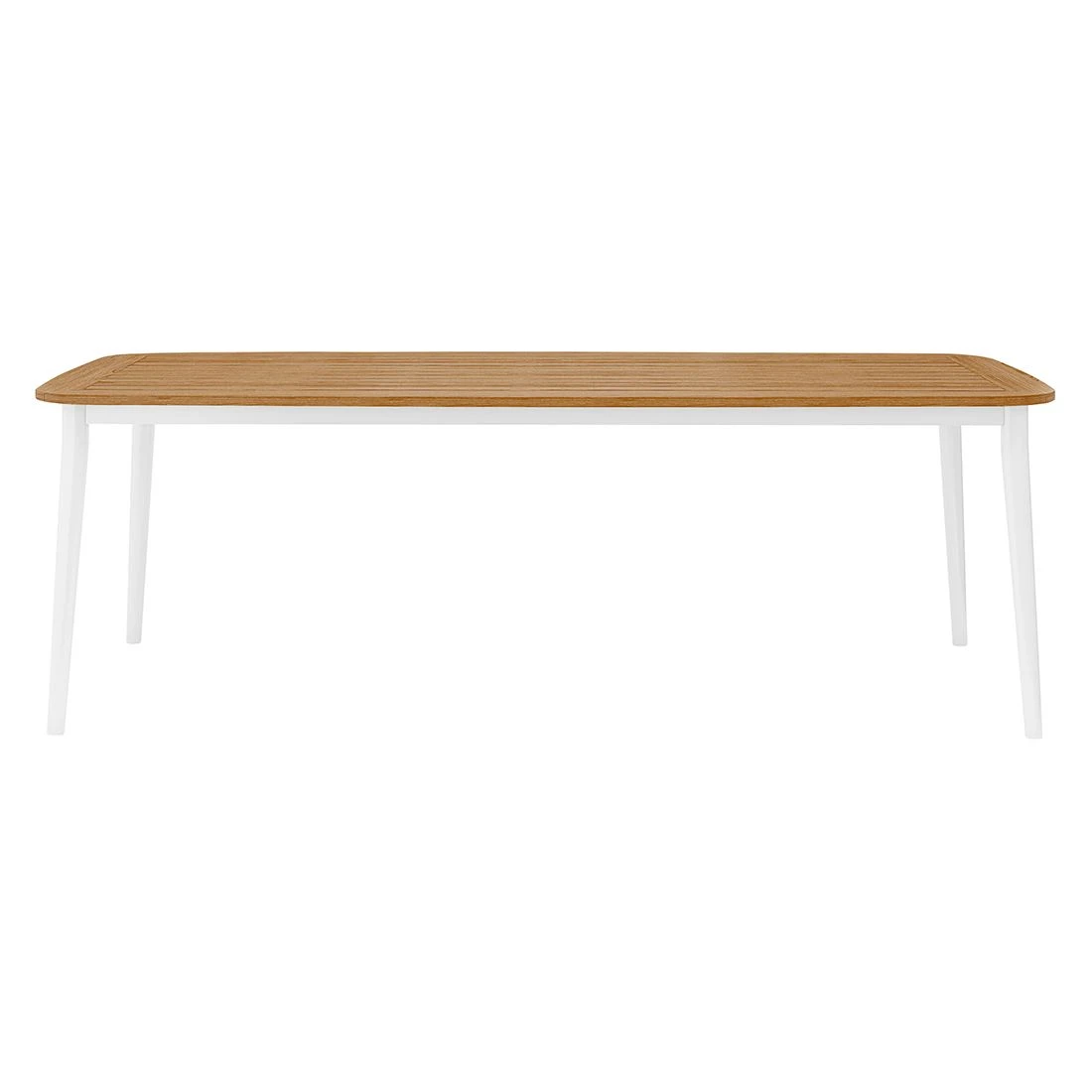 Dank des Gestell-Materials Aluminium zählt der Gartentisch Charlie zu den modernen Tischmodellen, die sich auf der Terrasse problemlos aufstellen und bewegen lassen. Optisch ist das Gestell in White gehalten. Als Material für die Tischplatte wird das hochwertige Hartholz Teak verwendet. Die Maserung dieses Holzes und der angenehme Farbton integrieren sich sehr schön in jegliche Arten der Garten- und Balkongestaltung und sorgen für eine einzigartig natürliche Atmosphäre. Farblich ist die Platte in Natur gehalten. Klassisch aus vier Tischbeinen besteht das Gestell des Tisches. Der Gartentisch ist klassisch rechteckig gestaltet.