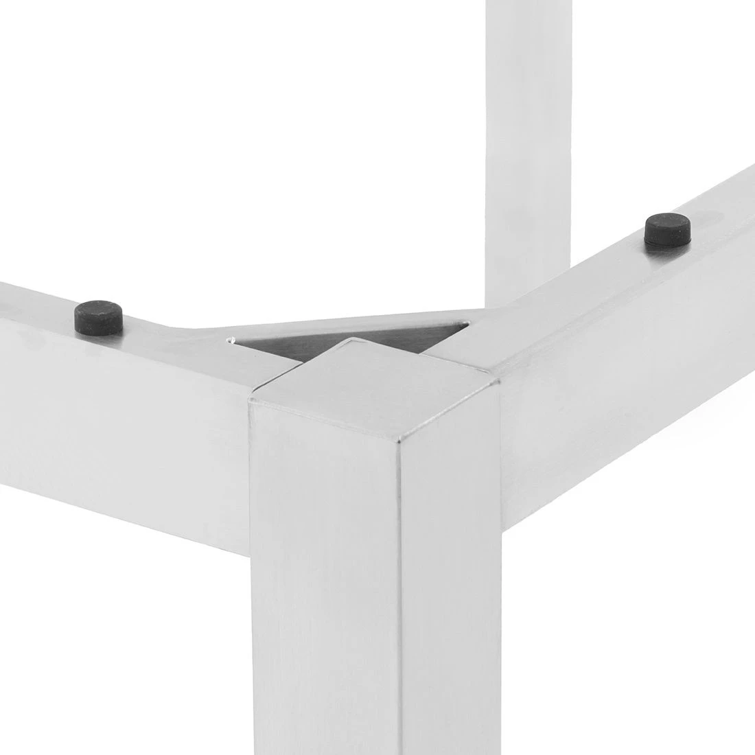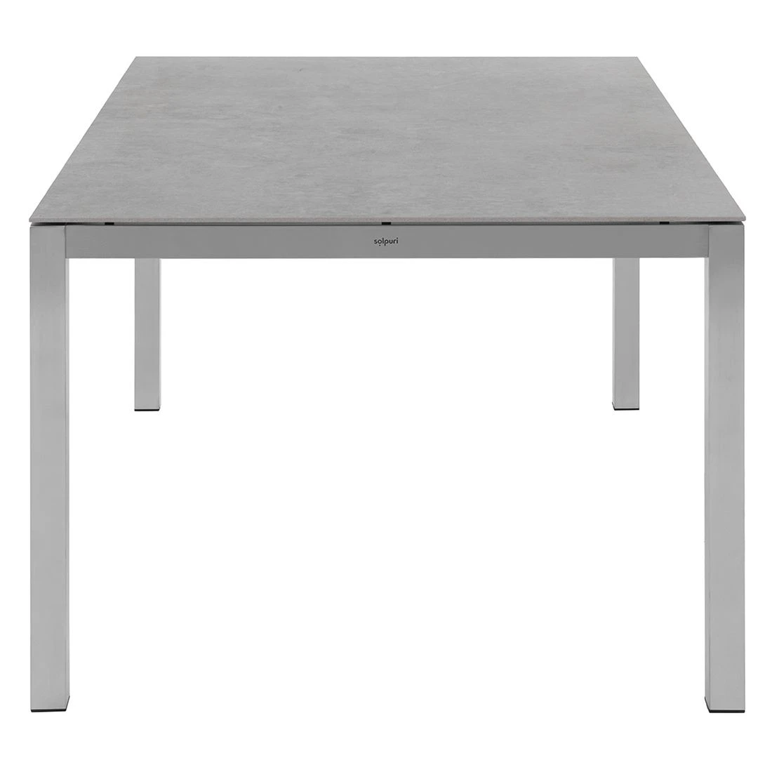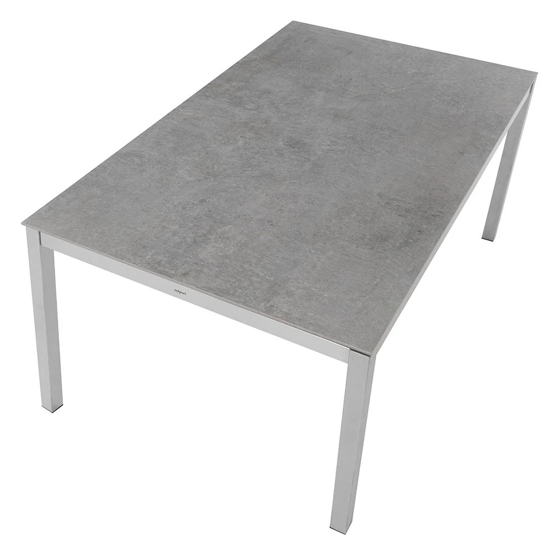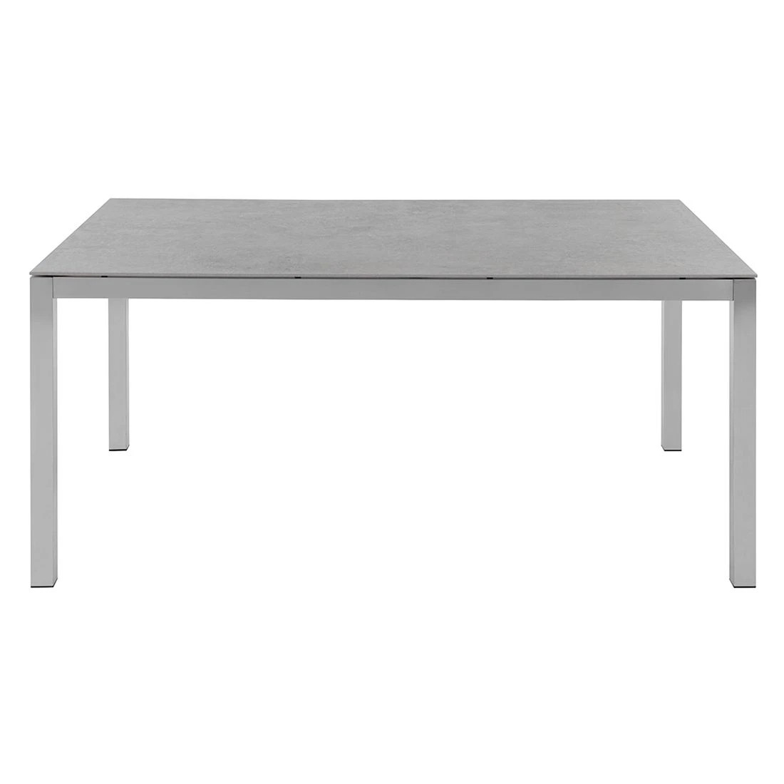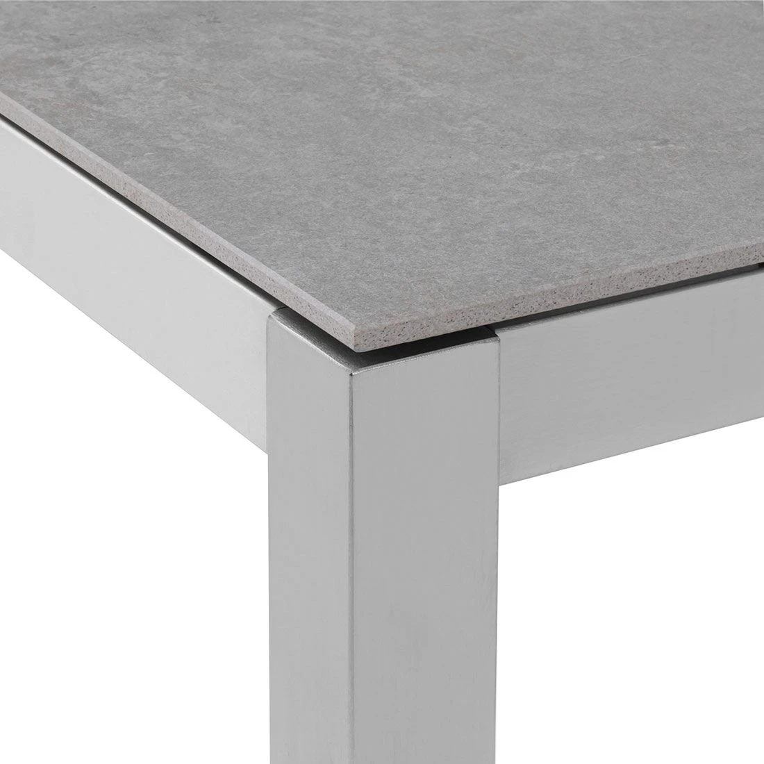 Als Gestellmaterial wird auserlesener und rostfreier Edelstahl verwendet. Farblich ist das Gestell in Silber gehalten. Die Tischplatte besteht aus Dekton. Dekton ist eine Mischung aus 20 natürlichen Mineralien. Bei der Herstellung von Dekton kommt eine besondere Technologie zum Einsatz, die in der Lage ist, mineralische Partikel so zu sintern, dass sie sich miteinander verbinden. Das Ergebnis: eine langlebige, sehr robuste und für jeden Einsatzbereich geeignete Tischplatte. Farblich ist die Platte in Kreta gehalten. Als klassische Design-Komponente fungiert das geradlinige Vierfußgestell. Mit der rechteckigen Form lässt sich der Gartentisch platzsparend in Ecken oder an Häuserwänden aufstellen.