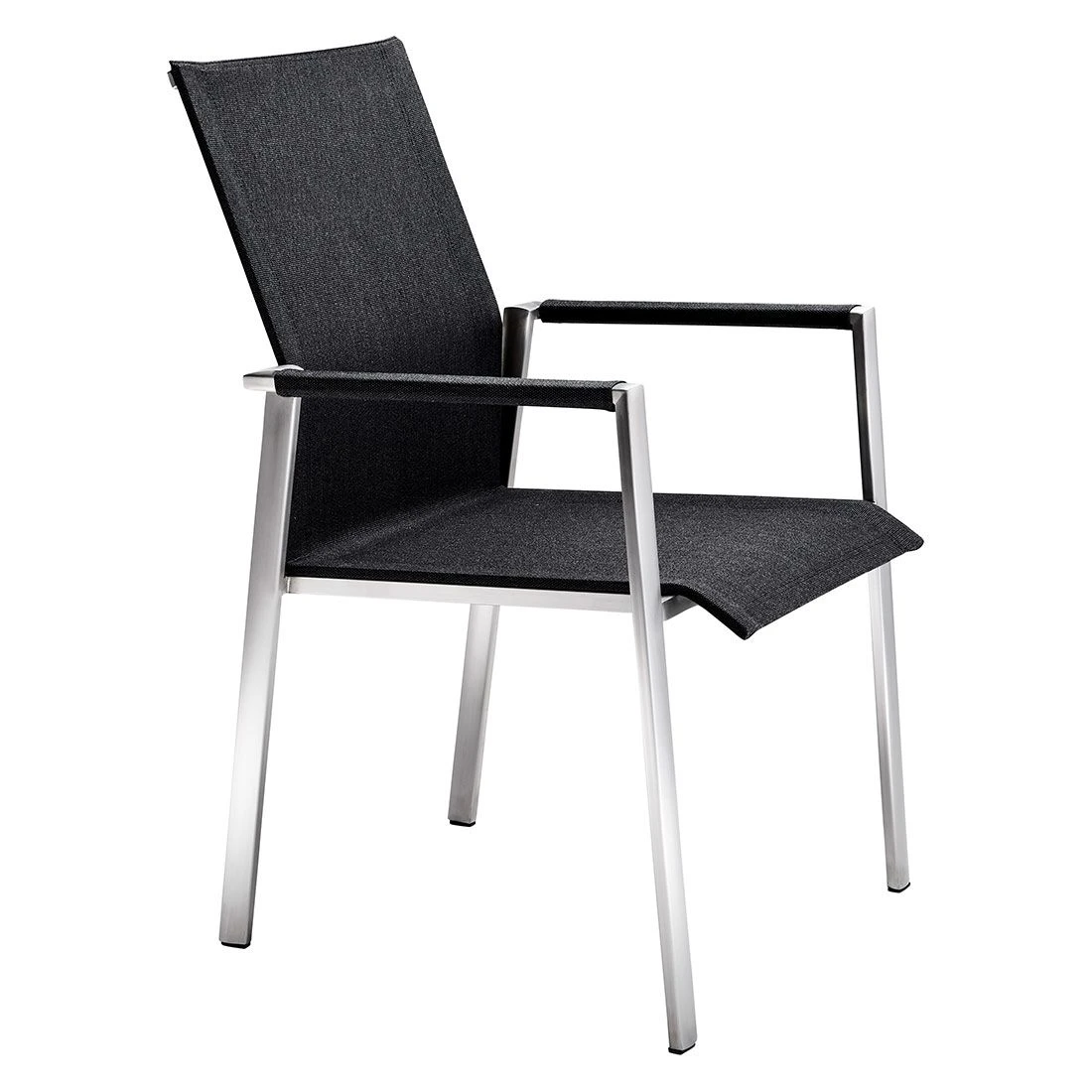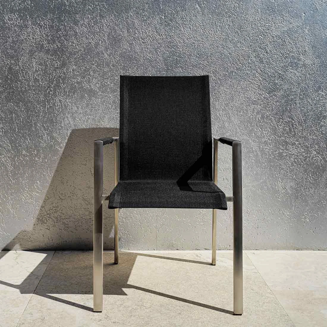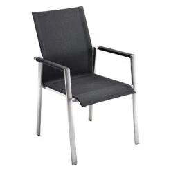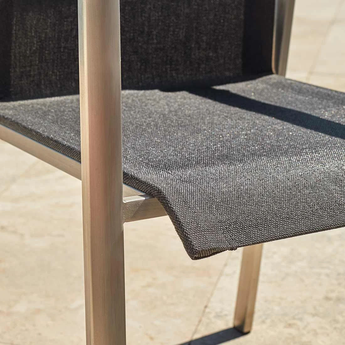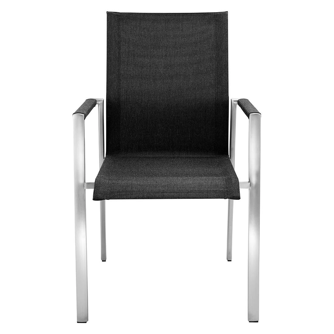 Das Gestell des Stapelsessels besteht aus hochwertigem und pflegeleichtem Edelstahl. Neben seiner ansprechenden Optik bietet dieses Material auch eine hohe Stabilität. Für eine attraktive Optik ist das Gestell im Farbton Silber gehalten. Ein weiterer Pluspunkt des Stapelsessels ist die Bespannung mit Textilene. Dieser Bezugsstoff überzeugt durch eine hohe Robustheit gegenüber Hitze und Frost und ist leicht zu reinigen. Die Sitzfläche hat eine schöne Farbgebung in Coal.