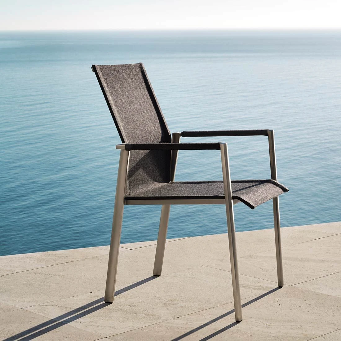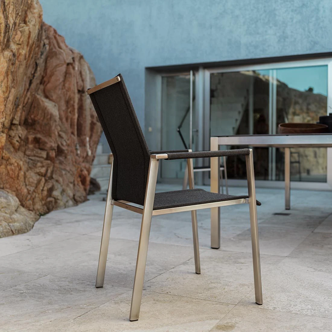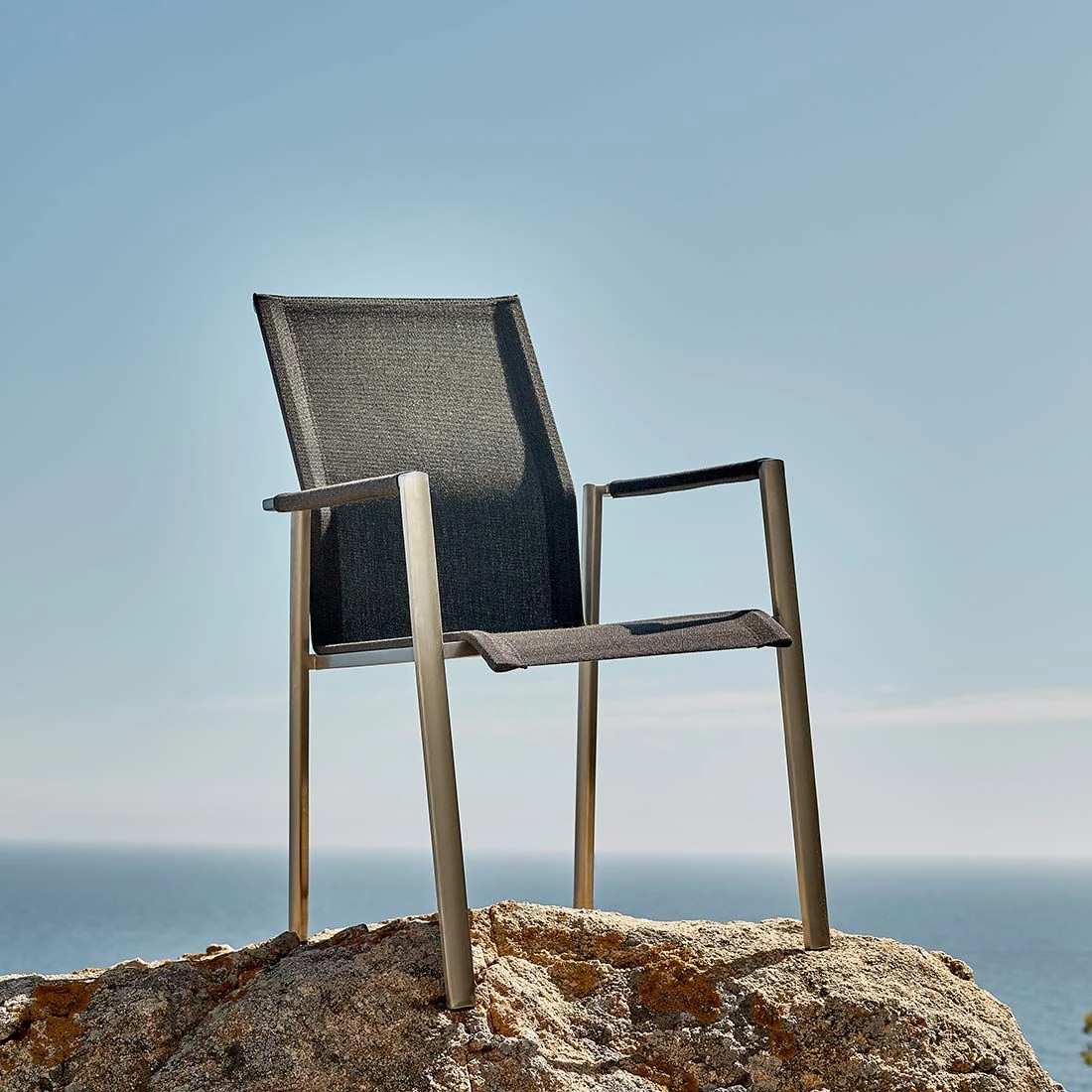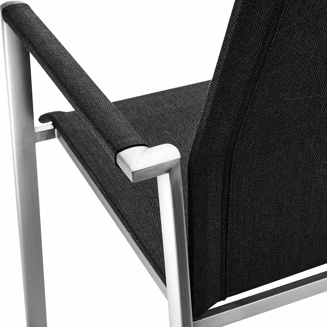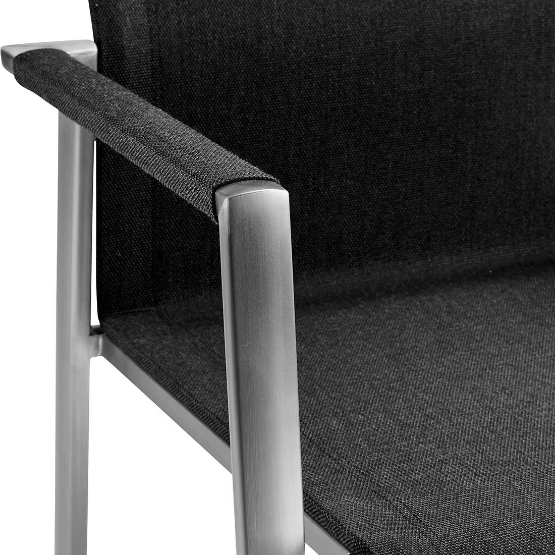 Das Gestell des Stapelsessels besteht aus hochwertigem und pflegeleichtem Edelstahl. Neben seiner ansprechenden Optik bietet dieses Material auch eine hohe Stabilität. Für eine attraktive Optik ist das Gestell im Farbton Silber gehalten. Ein weiterer Pluspunkt des Stapelsessels ist die Bespannung mit Textilene. Dieser Bezugsstoff überzeugt durch eine hohe Robustheit gegenüber Hitze und Frost und ist leicht zu reinigen. Die Sitzfläche hat eine schöne Farbgebung in Coal.
