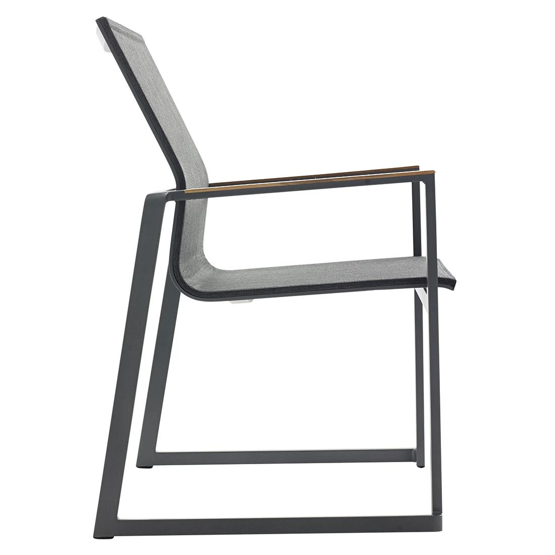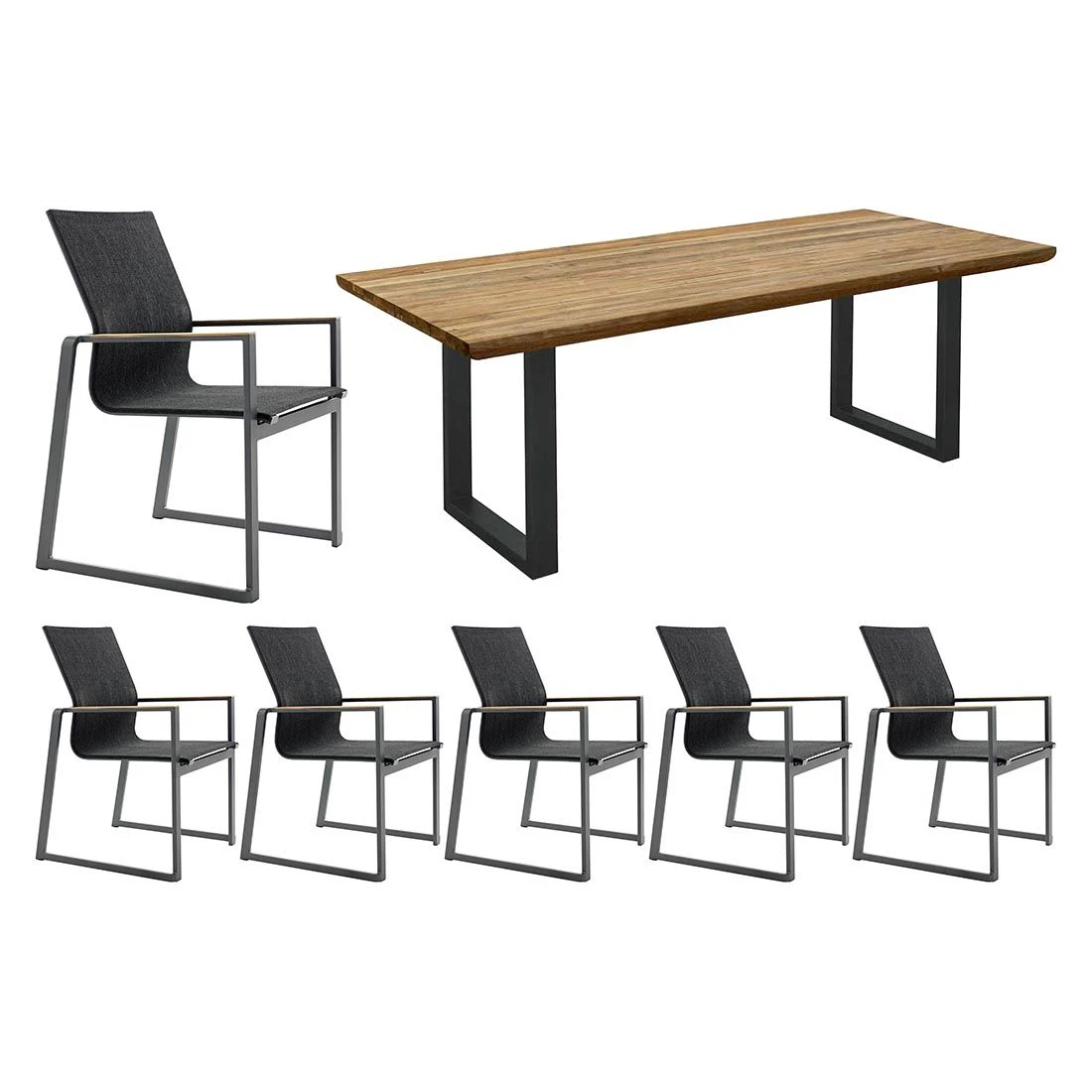 Die robusten Metallgestelle aus Aluminium sind pflegeleicht und garantieren gleichzeitig eine hohe Stabilität. Darüber hinaus gewährleistet dieses leichte Material, dass Sie die Möbel bequem transportieren können. Optisch ansprechend ist die Farbgebung der Gestelle in Anthrazit. Ein weiteres Highlight ist die Bespannung der Sitzflächen mit Textilene. Dieses Material zeichnet sich durch eine hohe Robustheit gegenüber Hitze und Frost aus und ist leicht zu reinigen. Die Farbgebung der Sitzfläche ist Coal. Im Setangebot enthalten ist auch ein passender Tisch. Die Platte wird aus recyceltem, also wiederverwertetem, Teakholz gefertigt. Hier werden bewusst alte Gebrauchsspuren wie Kerben oder Nagellöcher erhalten, so dass jeder Tisch ein wahres Unikat ist. Passend zum Gesamtbild des Gartenmöbel-Sets begeistert die Tischplatte mit ihrer Farbgebung in Natur. Der moderne Look des Gartenmöbel-Sets wird durch die attraktiven Kufen nochmals betont. Die Form des Tisches ist klassisch rechteckig gestaltet.