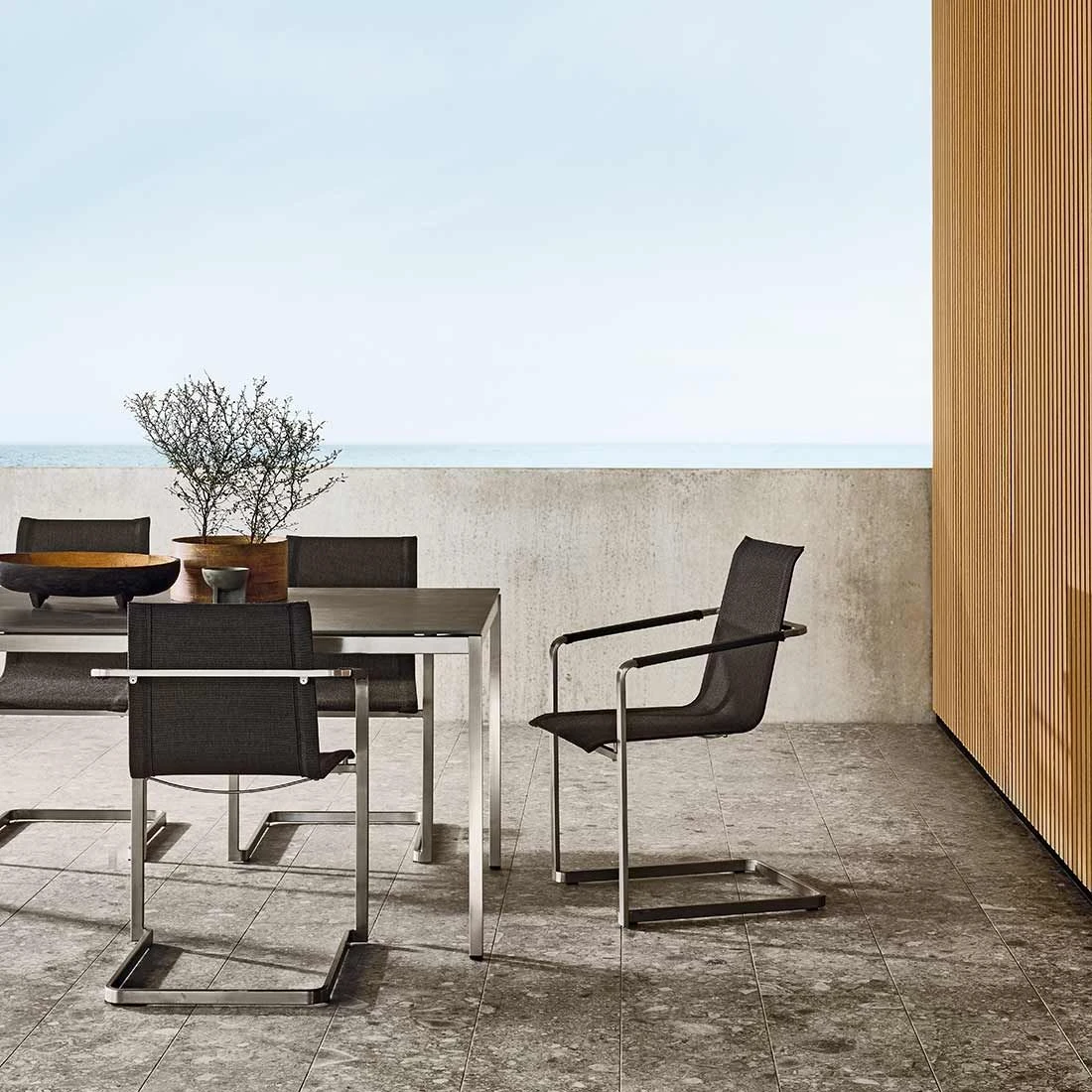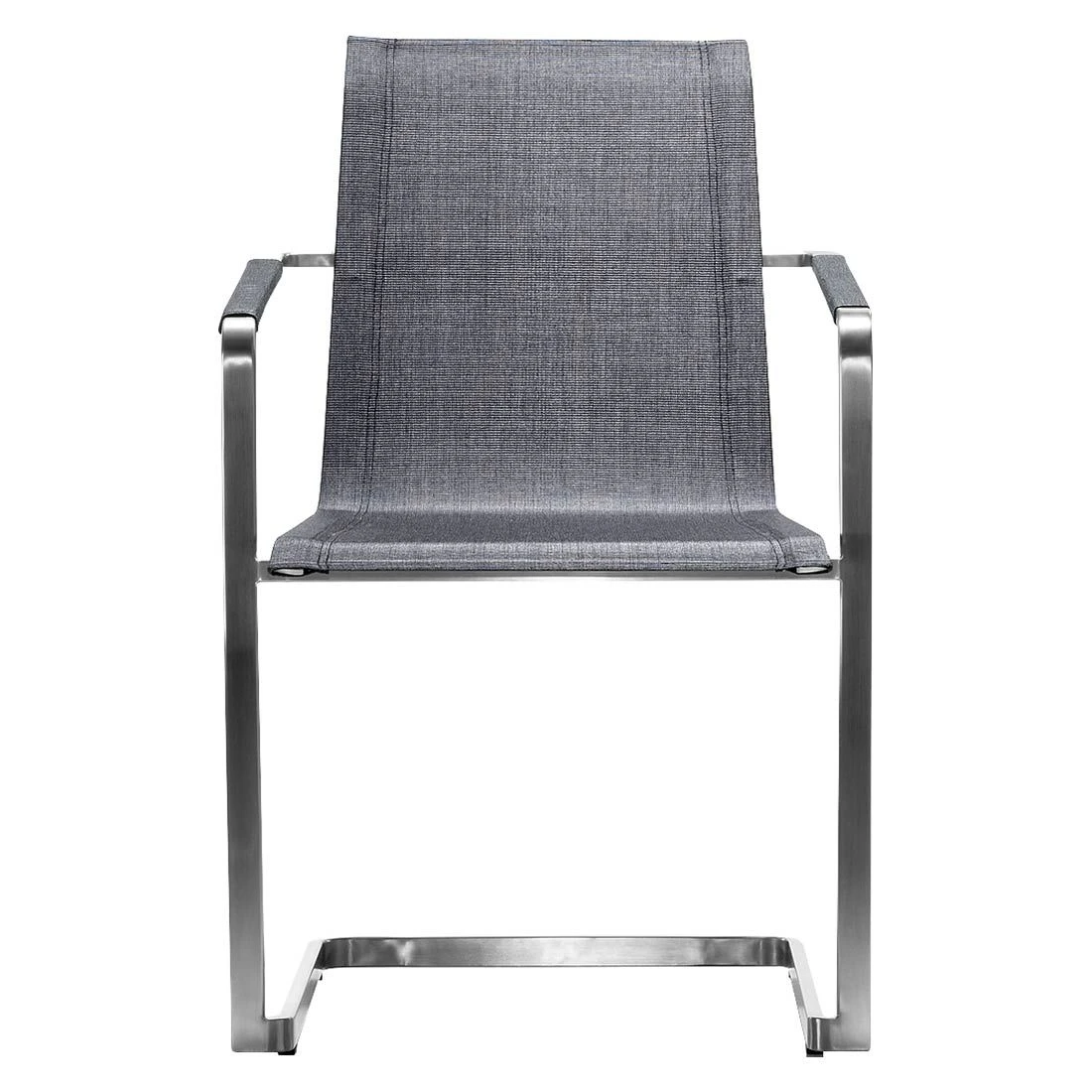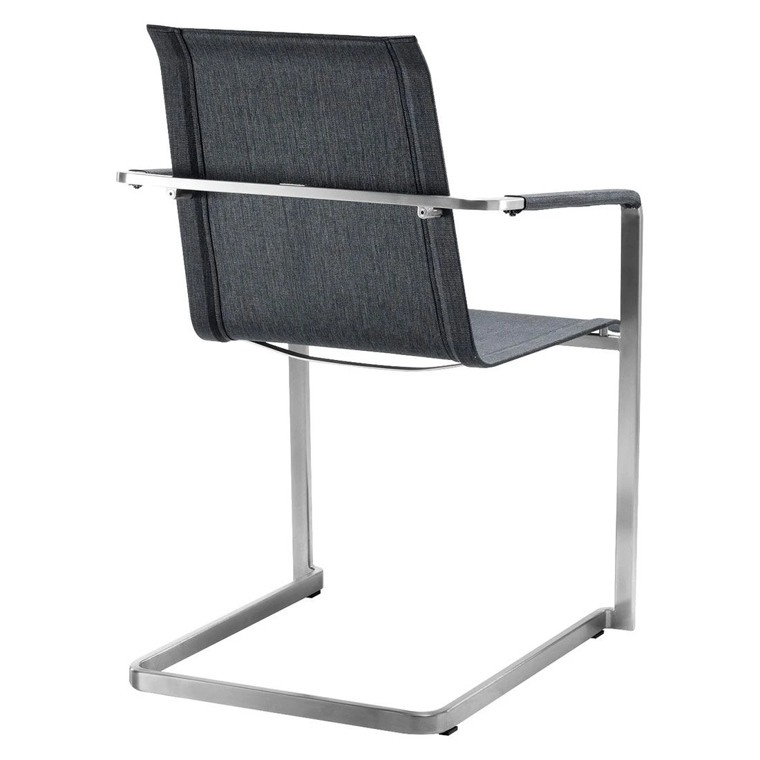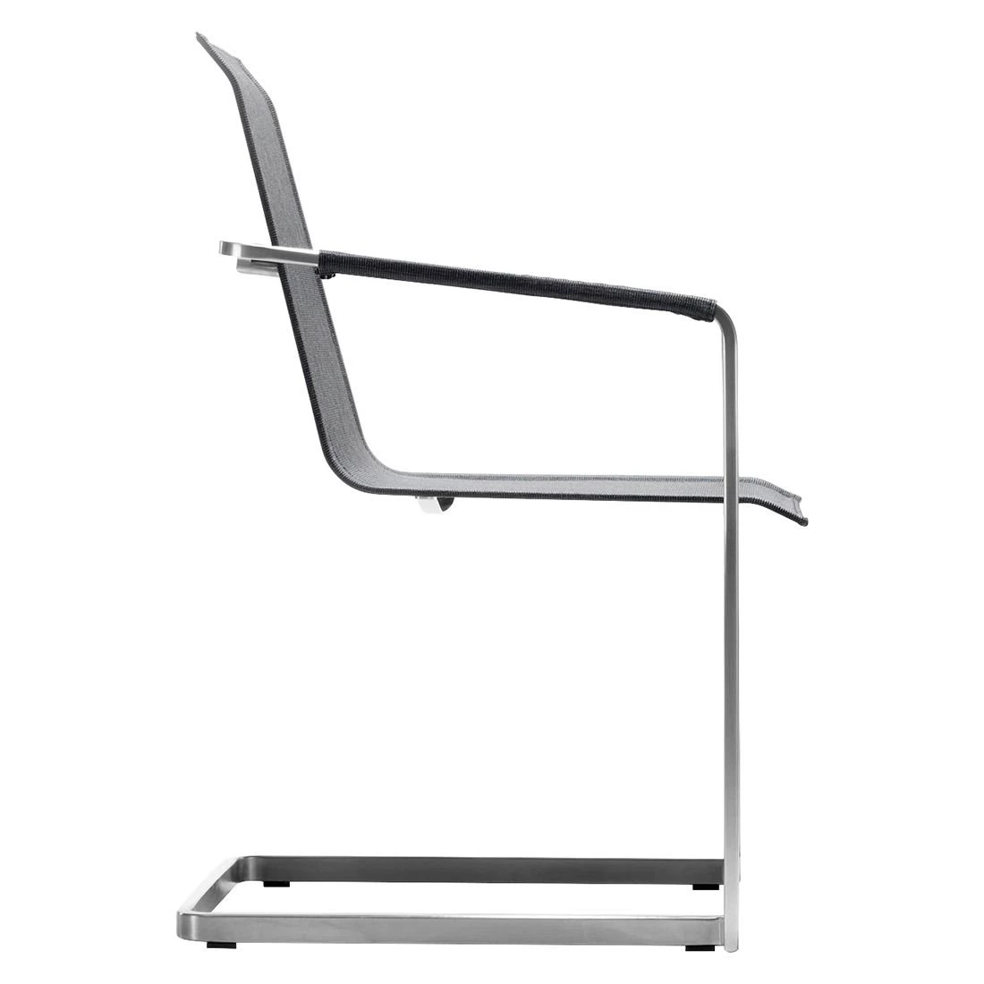 Das Gestell wird aus hochwertigem und rostfreiem Edelstahl hergestellt. Aufgrund des etwas höheren Eigengewichts, steht der Freischwinger dadurch besonders stabil und windsicher auf der Terrasse. Für eine attraktive Optik ist das Gestell im Farbton Silber gehalten. Ein weiterer Pluspunkt des Freischwingers ist die Bespannung mit Textilene. Dieser Bezugsstoff überzeugt durch eine hohe Robustheit gegenüber Hitze und Frost und ist leicht zu reinigen. Die Sitzfläche ist in ansprechendem Coal gehalten.