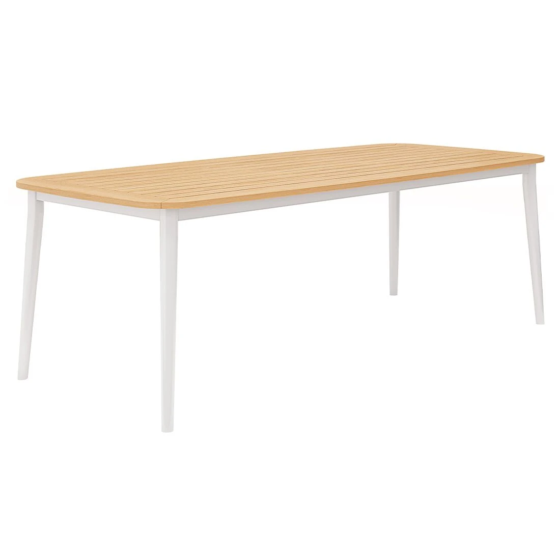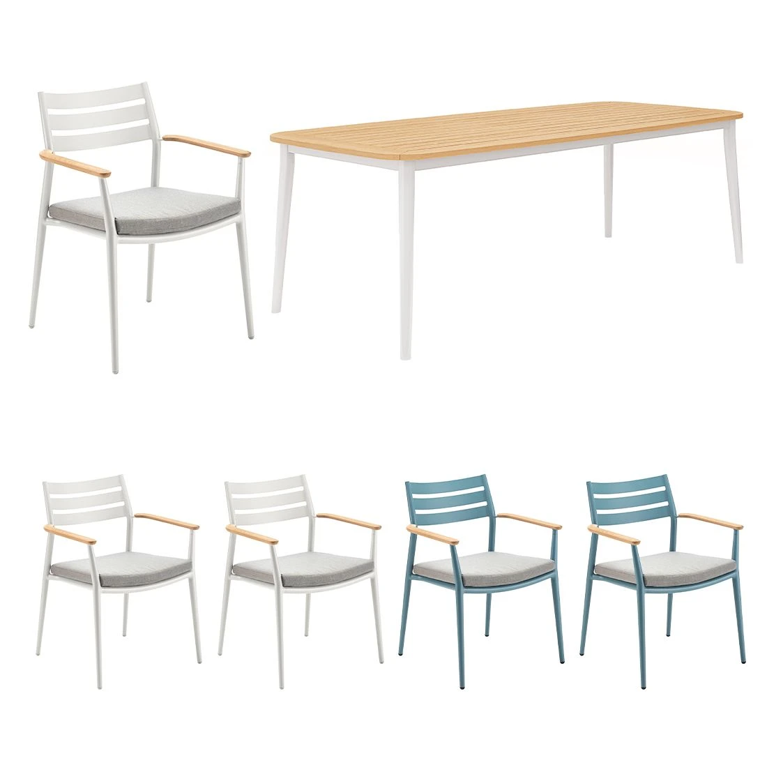 Die robusten Metallgestelle aus Aluminium sind pflegeleicht und garantieren gleichzeitig eine hohe Stabilität. Darüber hinaus gewährleistet dieses leichte Material, dass Sie die Möbel bequem transportieren können. Als hochwertiges Material für die Bezüge kommt ein Acryl-Stoff zum Einsatz. Er ist sehr strapazierfähig und bietet somit die idealen Voraussetzungen für den Einsatz im Freien. Farblich begeistern die Bezüge in elegantem Anthrazit. Im Preis des Sets ist ein passender Tisch enthalten. Teak ist besonders widerstandsfähig gegen Witterungseinflüsse wie Schwankungen in der Temperatur, Nässe und Trockenheit. Kein Wunder, dass dieses hochwertige Hartholz als Material für die Tischplatte verwendet wird. Die rechteckige Form ermöglicht es Ihnen, den Tisch in Ecken und an Häuserwänden platzsparend einzusetzen. Als klassische Design-Komponente fungiert das geradlinige Vierfußgestell.