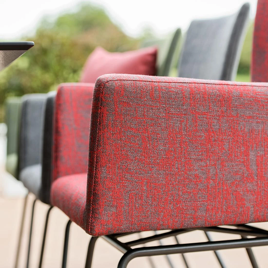 Die robusten Edelstahlgestelle sorgen für eine hohe Stabilität und Tragfähigkeit. Darüber hinaus begeistern diese mit einem zeitlos eleganten Look. Optisch ansprechend ist die Farbgebung der Gestelle in Silber. Das Gartenmöbel-Set ist mit einem robusten Outdoorstoff bezogen. Farblich begeistern die Bezüge in elegantem Bunt. Im Set enthalten ist zudem ein Tisch. Die ansprechende HPL-Tischplatte ist nicht nur ein optischer Hingucker, sondern besitzt zudem eine außerordentlich massive und absolut kratzfeste Oberfläche, die einer Vielzahl von Belastungen entgegenwirkt. Passend zum Gesamtbild des Gartenmöbel-Sets begeistert die Tischplatte mit ihrer Farbgebung in Zement. Als klassische Design-Komponente fungiert das geradlinige Vierfußgestell.