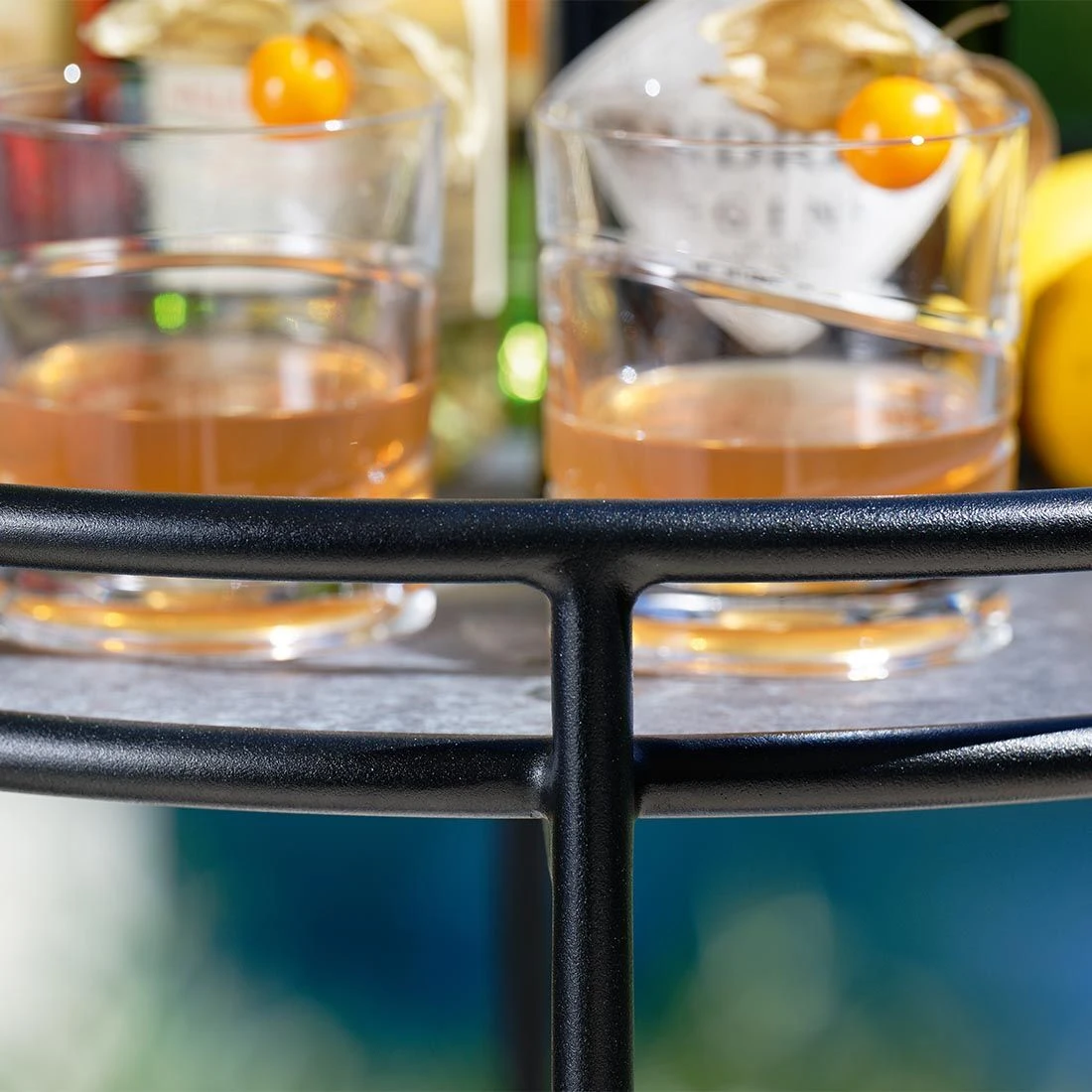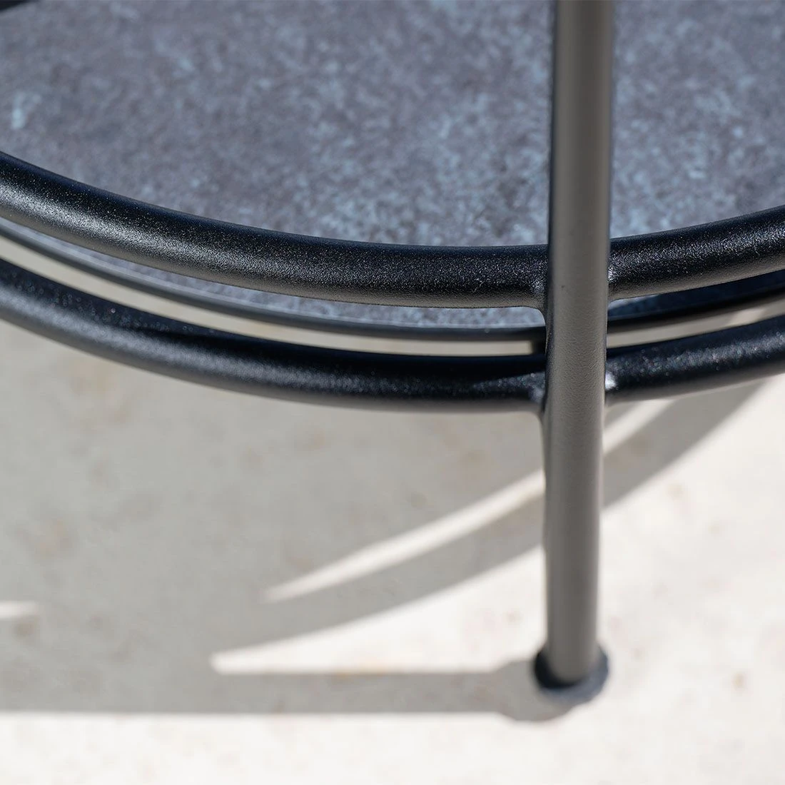 Das Gestell des attraktiven Tisches besteht aus Aluminium. Die langlebige Tischplatte besteht aus Silverstar. Dieses Material wird aus bis zu 50 Lagen Papierlaminatschichten gefertigt, die unter großer Hitze und hohem Druck verpresst werden. Diese Technik verleiht der Tischplatte ganz besondere Eigenschaften, denn sie ist kratzfest, kälte- (-20 °C) und hitzebeständig (180 °C), UV-beständig, pflegeleicht und abriebfest. Unabhängig von der Vielzahl an Dekoren ist der Kern immer schwarz, was man an der Kante der Platte erkennen kann. Für ein elegantes Gesamtbild erscheint die Platte in der Farbe Slate. Das Design des Beistelltischs ist klassisch rund.