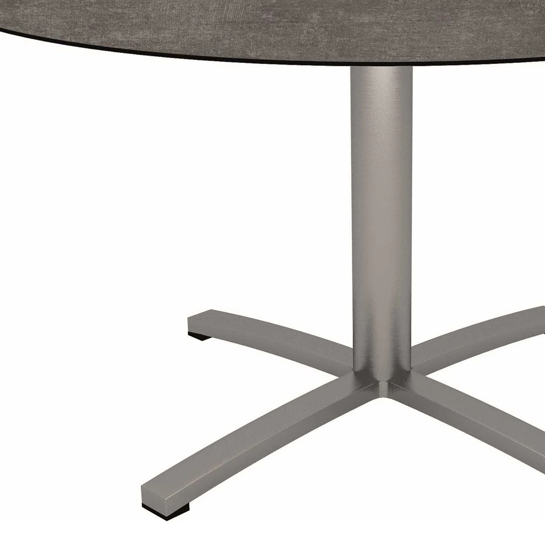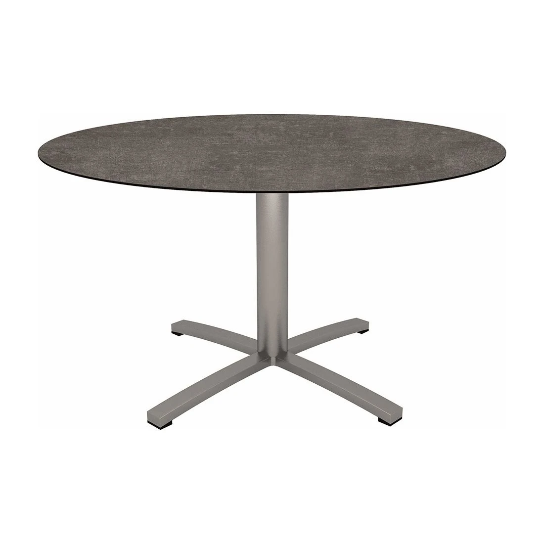 Als Gestellmaterial wird hochwertiger und rostfreier Edelstahl verarbeitet. Den finalen Schliff erhält das Gestell durch seine attraktive Säulenform. Diese ist nicht nur ein absoluter Blickfang, sondern ermöglicht auch rundherum viel Beinfreiheit. Bei der Tischplatte handelt es sich um eine sogenannte Silverstar-Platte. Dieses Material wird aus bis zu 50 Lagen Papierlaminatschichten gefertigt, die unter großer Hitze und hohem Druck verpresst werden. Diese Technik verleiht der Tischplatte ganz besondere Eigenschaften, denn sie ist kratzfest, kälte- (-20 °C) und hitzebeständig (180 °C), UV-beständig, pflegeleicht und abriebfest. Unabhängig von der Vielzahl an Dekoren ist der Kern immer schwarz, was man an der Kante der Platte erkennen kann. Farblich ist die Platte in Metallic Grau gehalten. Der Gartentisch ist in seiner Form klassisch rund gestaltet.