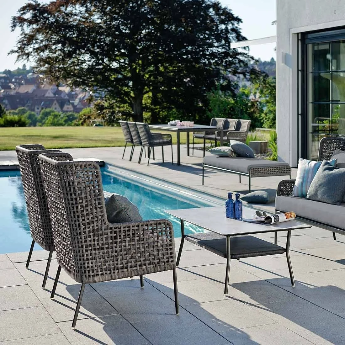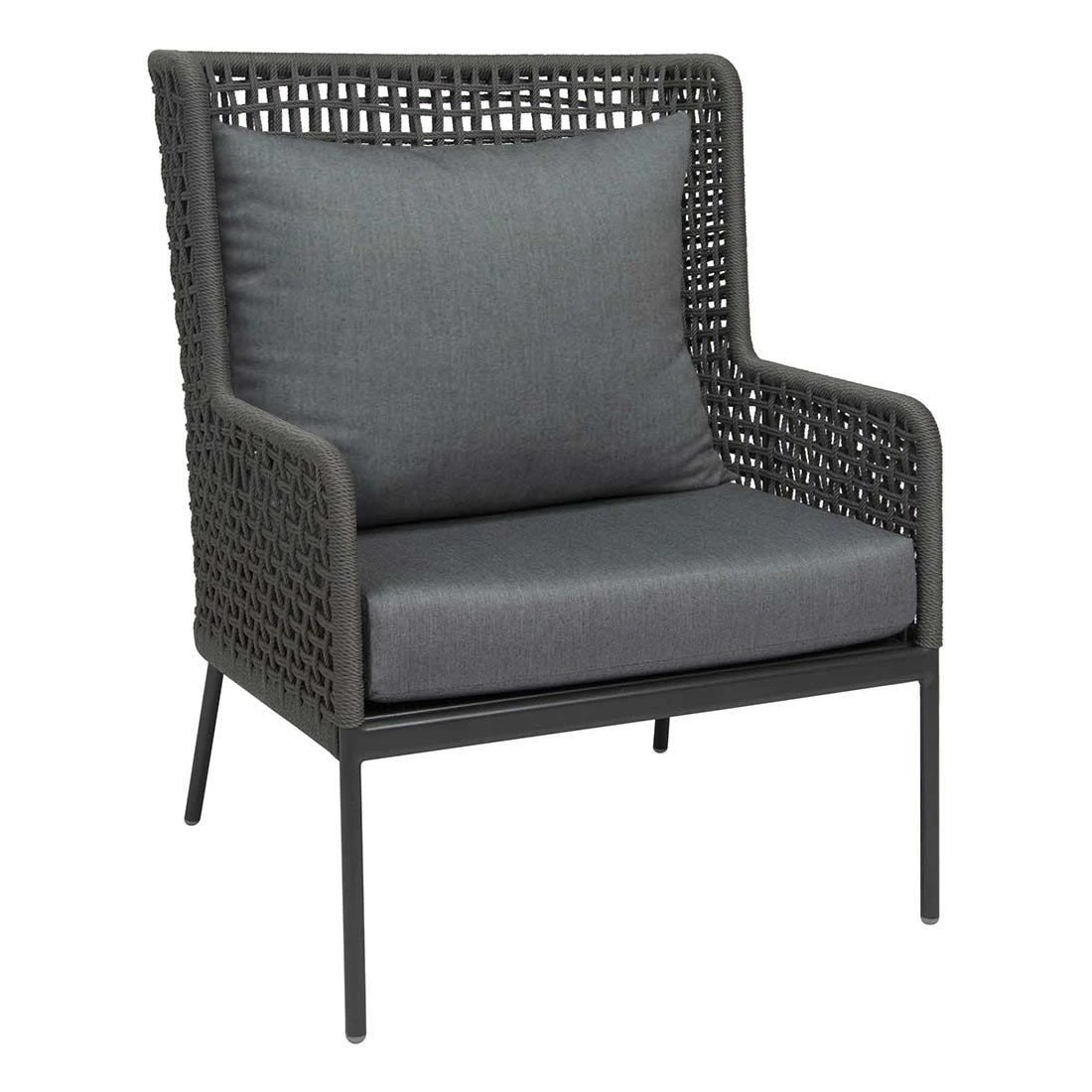Für die Herstellung des Gestells wird hochwertiges und wetterfestes Aluminium verwendet. Farblich ist es in attraktivem Anthrazit gehalten. Das Gestell ist mit Rope umflochten und bringt somit ein gemütliches Flair auf Ihre Terrasse. Die Sitzfläche ist mit einem outdoortauglichen und komfortablen Stoff in der Farbe Seidengrau bezogen. Bei langen Feuchtigkeitsperioden empfehlen wir für eine längere Haltbarkeit dennoch eine Lagerung der abnehmbaren Kissen im Inneren.