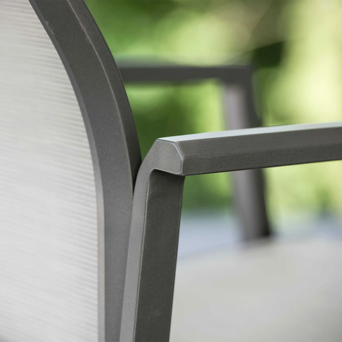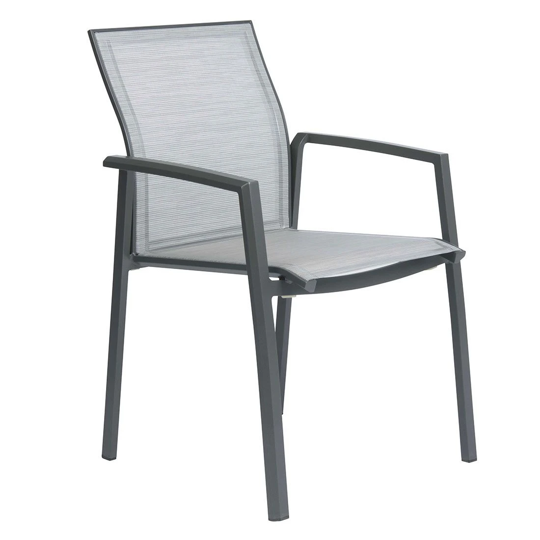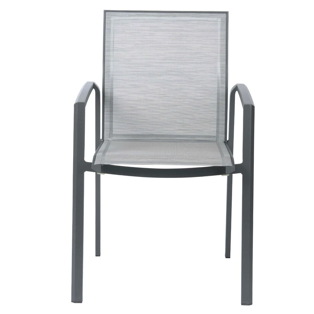 Das Gestell besteht aus pflegeleichtem und wetterfestem Aluminium. Für eine attraktive Optik ist das Gestell im Farbton Anthrazit gehalten. Für die Bespannung der Sitzfläche verlässt sich der Hersteller auf hochwertiges Textilene. Es zeichnet sich durch eine hohe Robustheit gegenüber Hitze und Frost aus und ist leicht zu reinigen. Damit der Stapelsessel optisch ansprechend ist, sind die Sitzfläche und der Bezug im Farbton Silber gehalten.