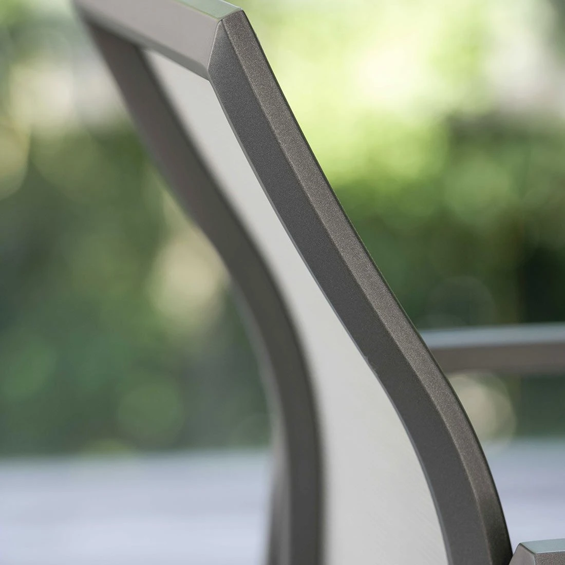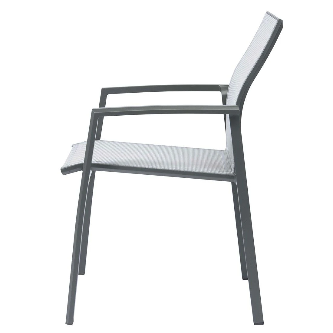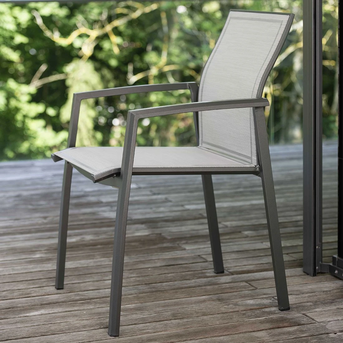 Das Gestell besteht aus pflegeleichtem und wetterfestem Aluminium. Für eine attraktive Optik ist das Gestell im Farbton Anthrazit gehalten. Für die Bespannung der Sitzfläche verlässt sich der Hersteller auf hochwertiges Textilene. Es zeichnet sich durch eine hohe Robustheit gegenüber Hitze und Frost aus und ist leicht zu reinigen. Damit der Stapelsessel optisch ansprechend ist, sind die Sitzfläche und der Bezug im Farbton Silber gehalten.