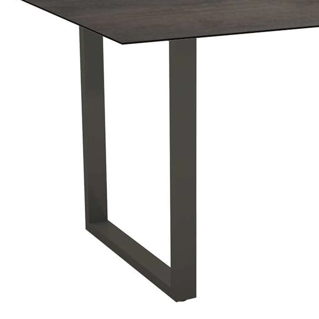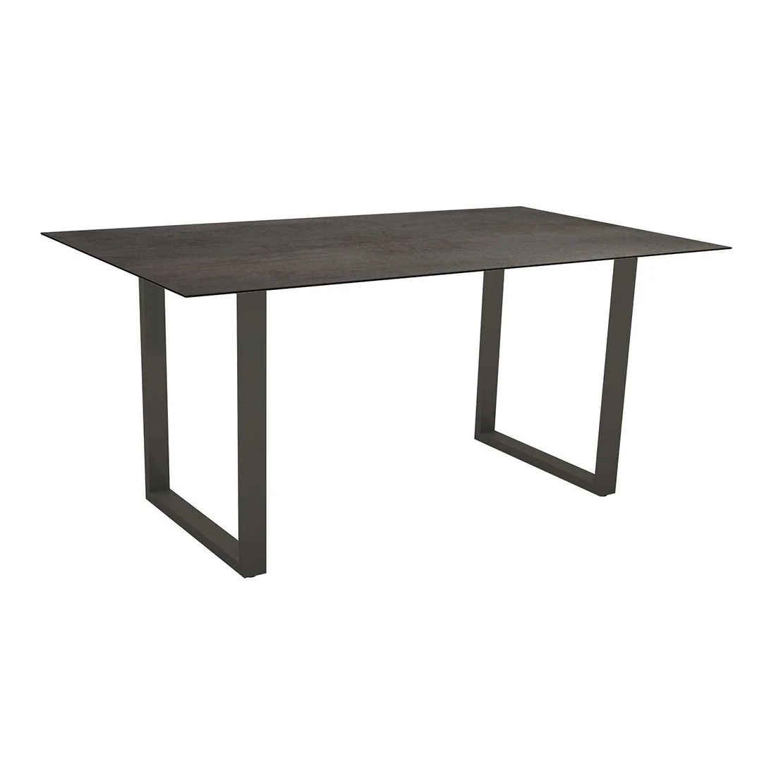 Als Material des Gestells dient hochwertiges und leichtes Aluminium. Der moderne Look des Gartentisches wird durch die attraktiven Kufen nochmals betont. Die langlebige Tischplatte besteht aus Silverstar. Dieses Material wird aus bis zu 50 Lagen Papierlaminatschichten gefertigt, die unter großer Hitze und hohem Druck verpresst werden. Diese Technik verleiht der Tischplatte ganz besondere Eigenschaften, denn sie ist kratzfest, kälte- (-20 °C) und hitzebeständig (180 °C), UV-beständig, pflegeleicht und abriebfest. Unabhängig von der Vielzahl an Dekoren ist der Kern immer schwarz, was man an der Kante der Platte erkennen kann. Farblich ist die Tischplatte in einem schönen Nitro gehalten. Der Gartentisch ist klassisch rechteckig gestaltet.