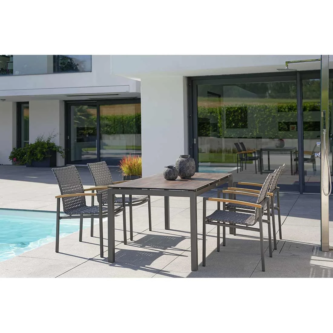 Für die Herstellung des Gestells wird hochwertiges und wetterfestes Aluminium verwendet. Für eine attraktive Optik ist das Gestell im Farbton Anthrazit gehalten. Die Sitzfläche aus Polypropylen ist wasserabweisend, schnelltrocknend und UV-beständig. Zudem ist dieses Material pflegeleicht und somit bestens für den Einsatz im Freien geeignet. Die Sitzfläche ist in ansprechendem Platin gehalten.