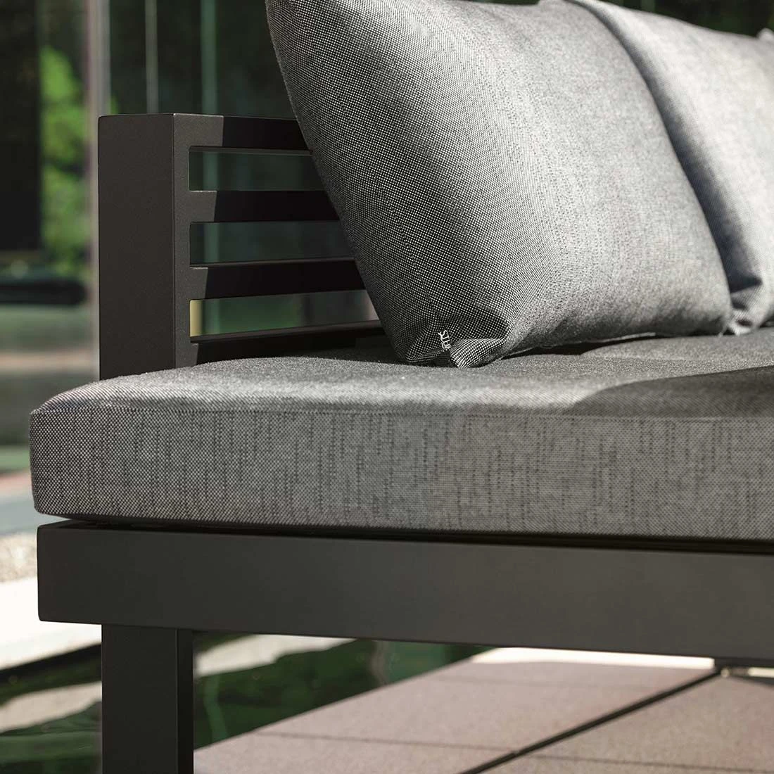 Das Gestell wird aus Aluminium in der Farbe Schwarz Matt gefertigt. Das geringe Eigengewicht des Materials macht die Loungebank zu einem robusten, aber dennoch leicht zu transportierenden Möbel auf Ihrer Terrasse.