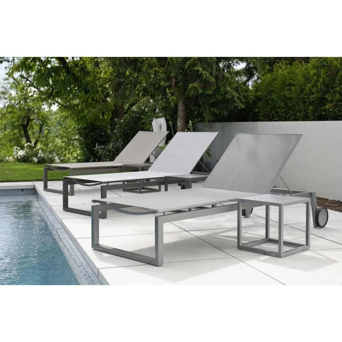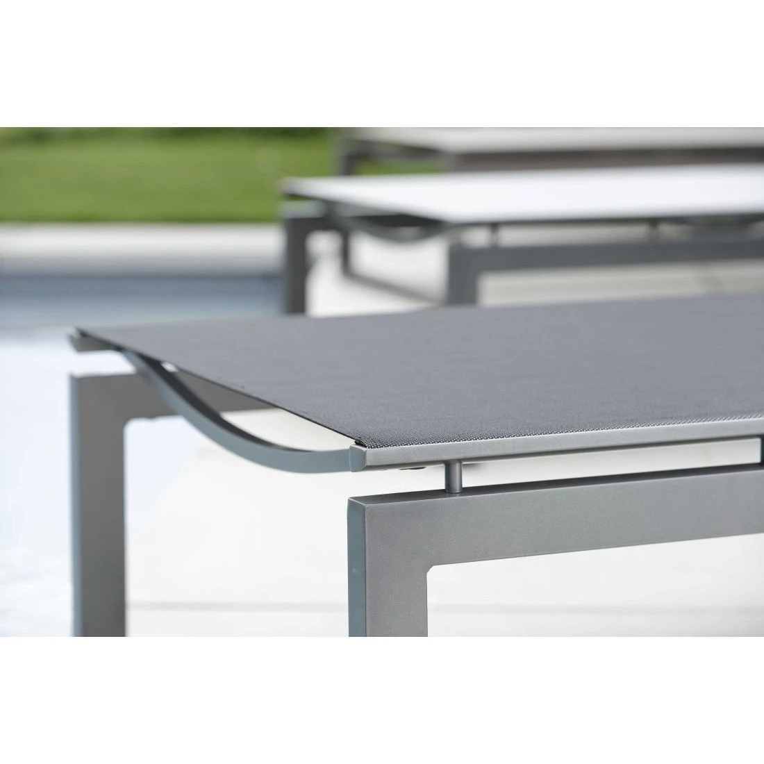 Das Gestell wird aus Aluminium gefertigt. Das Material macht die Gartenliege zu einem robusten Möbel auf Ihrer Terrasse. Farblich ist dieses in Graphit gehalten. Die Sitzfläche ist in ansprechendem Silbergrau gehalten. Für den Korpus, die Sitzfläche und den Bezug kommt Textilene zum Einsatz.