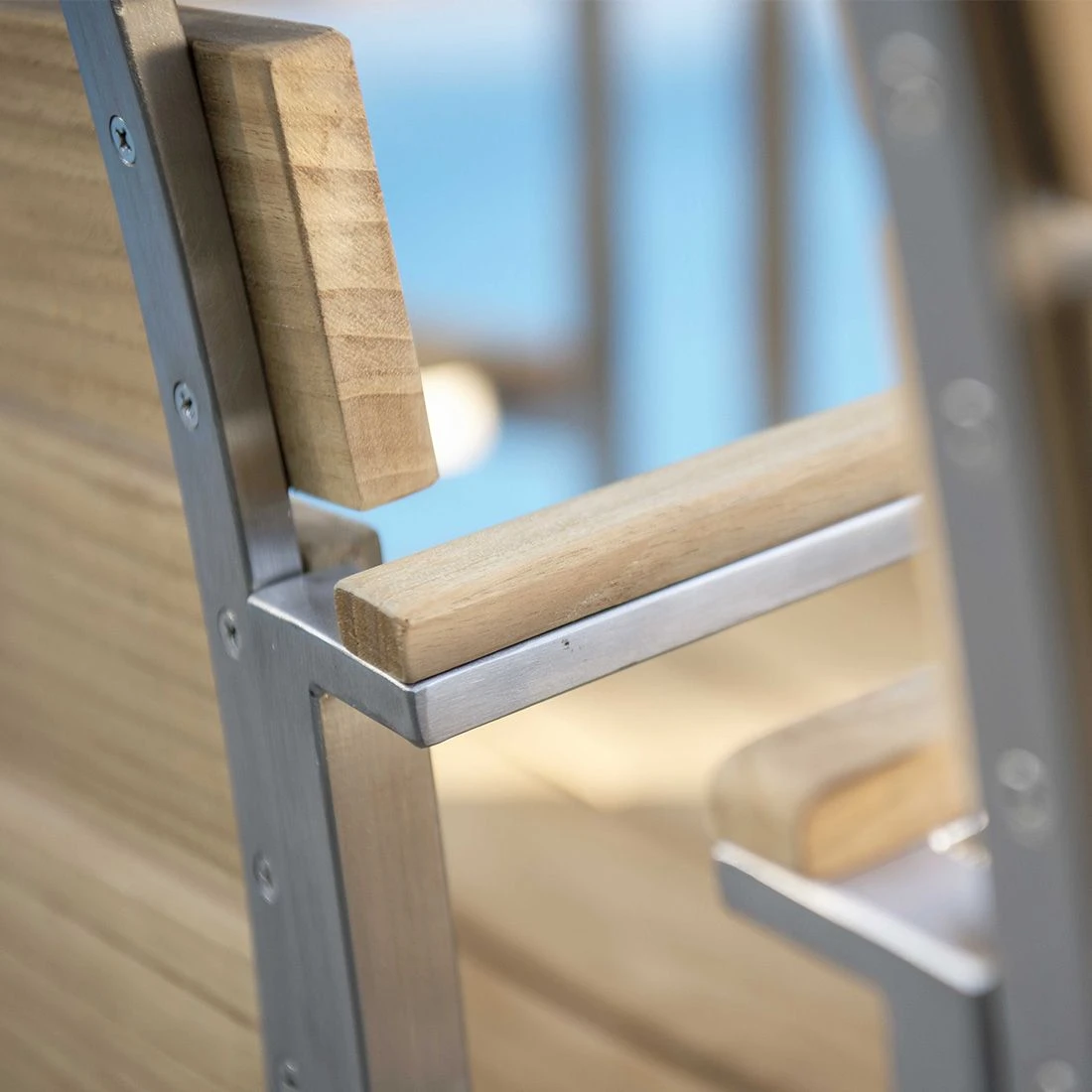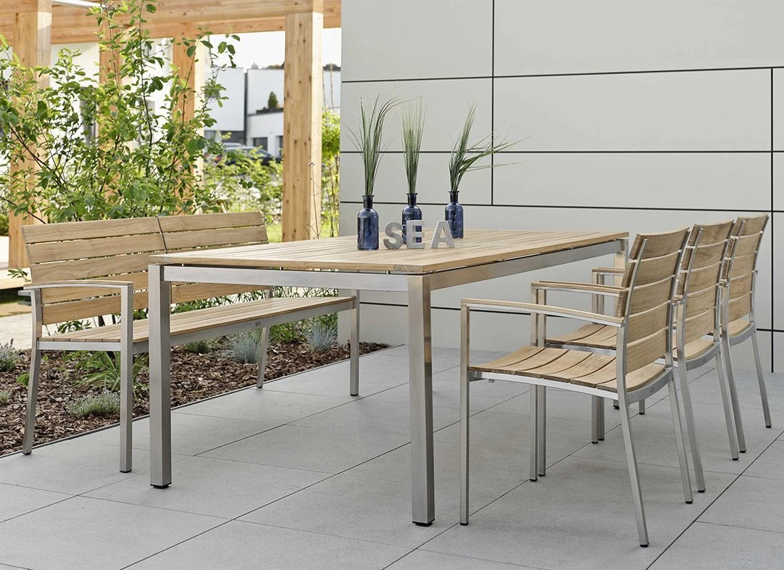 Für die Sitzfläche und die Tischplatte kommt Massivholz zum Einsatz. Damit das Gartenmöbel-Set optisch ansprechend ist, sind die Tischplatte und die Sitzfläche im Farbton Natur gehalten. Die robusten Edelstahlgestelle sorgen für eine hohe Stabilität und Tragfähigkeit. Darüber hinaus begeistern diese mit einem zeitlos eleganten Look. Optisch ansprechend ist die Farbgebung der Gestelle in Silber. Als klassische Design-Komponente fungiert das geradlinige Vierfußgestell.