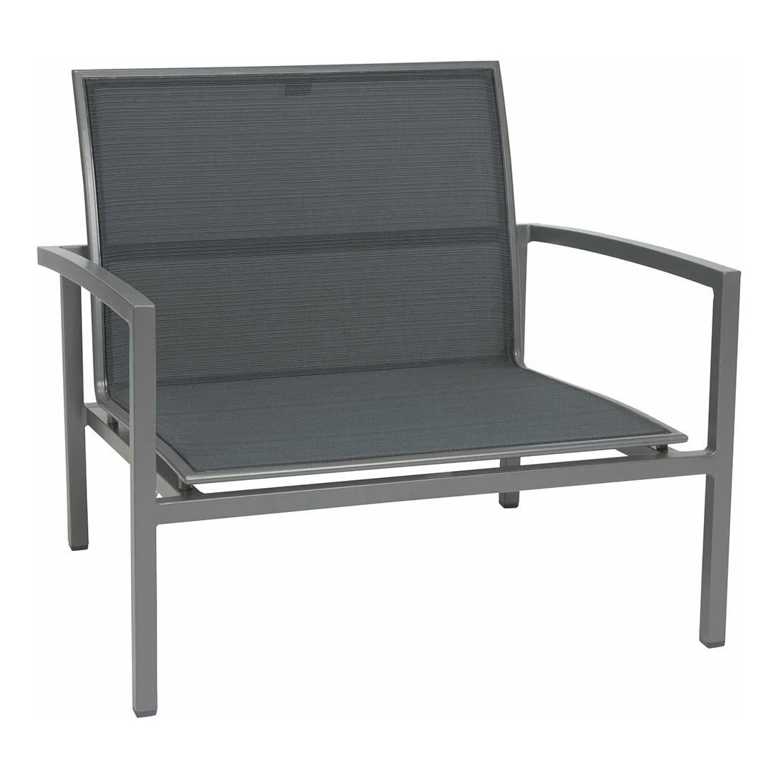 Das Gestell besteht aus pflegeleichtem und wetterfestem Aluminium in der Farbe Graphit. Ein Material, das sowohl durch Leichtigkeit als auch Robustheit überzeugt. Die Sitzfläche ist mit Textilene bespannt. Dieses Material ist reiß- und wetterfest.