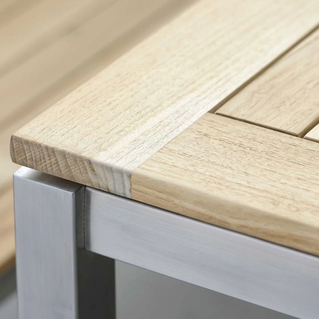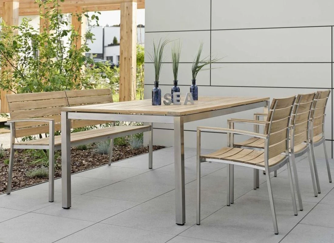 Teak ist außerordentlich widerstandsfähig gegen Witterungseinflüsse wie Schwankungen der Temperatur, Nässe und Trockenheit. Kein Wunder, dass für die Tischplatte dieses hochwertige Holz als Material für die Tischplatte gewählt wurde. Farblich ist die Platte in Braun gehalten.