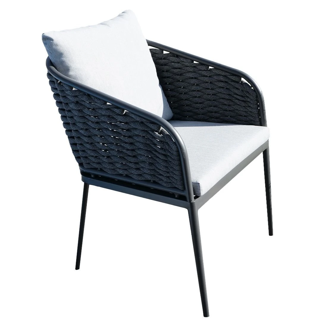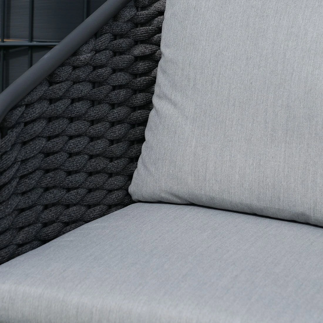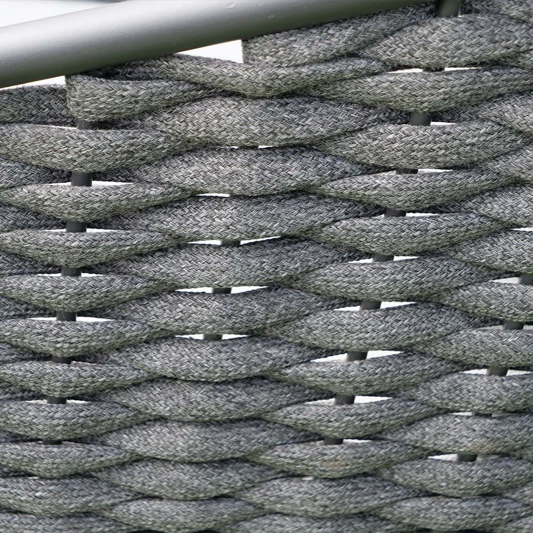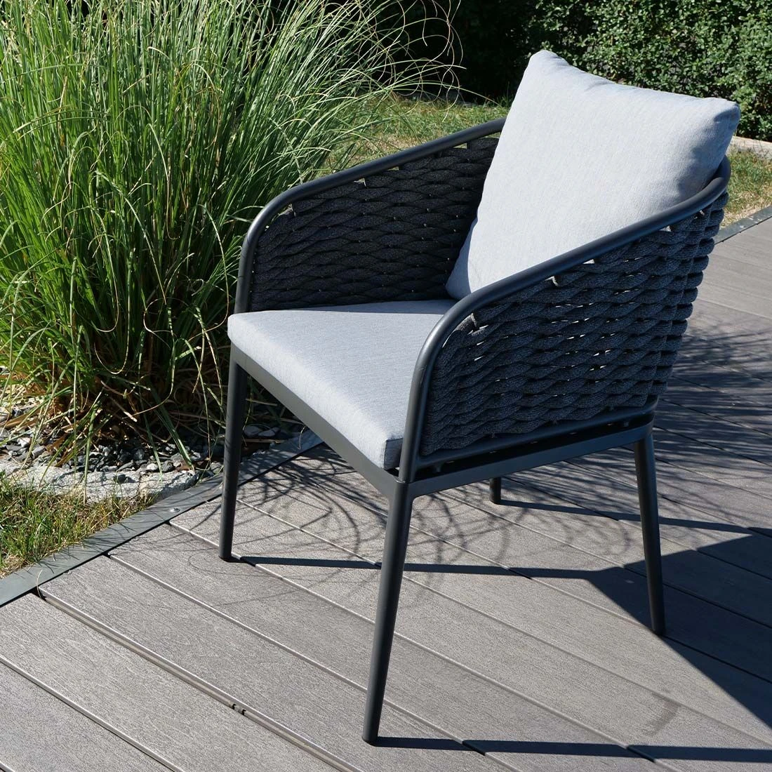 Die Sitzfläche besteht aus modernem Rope-Geflecht. Der Gartensessel ist mit einem robusten und wetterfesten Outdoorstoff in der Farbe Grau bezogen. Dieser trotzt Wind und Wetter sehr gut. Wir empfehlen dennoch, die abnehmbaren Kissen bei länger andauernder Feuchtigkeit drinnen zu lagern.