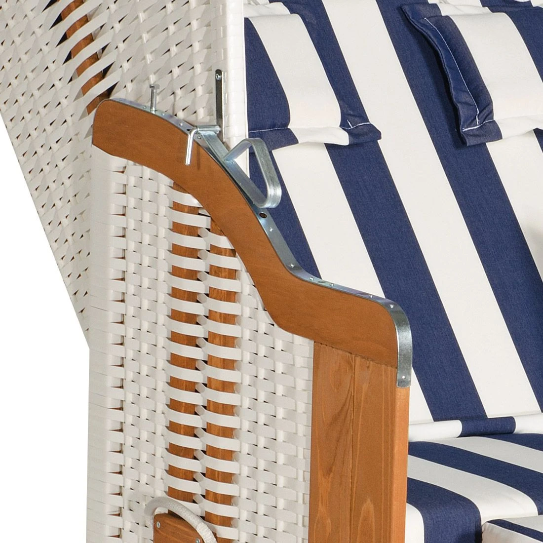 Als Bezug dient bei diesem Strandkorb ein Gewebe aus Strukturpolyester. Das Material begeistert mit der angenehmen Oberflächenstruktur und einer herausragenden Witterungsbeständigkeit. Der Strandkorb selbst besteht aus Fichtenholz sowie Kunststoffgeflecht. Beides harmoniert hervorragend miteinander. Das Grundgerüst des Strandkorbs ist in Natur gehalten. Äußerlich überzeugt der Strandkorb Sunny Smart mit seinem Kunststoffgeflecht im Farbton Weiß.