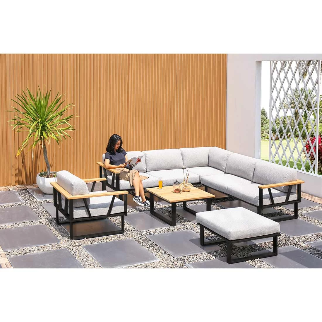 Das Gestell ist aus hochwertigem, rostfreiem Edelstahl gefertigt. Durch das etwas höhere Eigengewicht steht die Ecklounge besonders stabil und windsicher auf der Terrasse. Optisch begeistert das Gestell in der Farbe Graphit. Die Sitz- und Rückenfläche ist aus dem Marken-Outdoorstoff Olefin gefertigt. Das Material verbindet eine angenehme Stoffoberfläche mit hoher Witterungsbeständigkeit. Denn sowohl Sonne als auch Regen können dem robusten Outdoor-Stoff kaum etwas anhaben. Die Tischplatte besteht aus Natur, weshalb Sie die Ecklounge optimal im Garten oder auf der Terrasse verwenden können. Die Tischplatte ist Natur.
