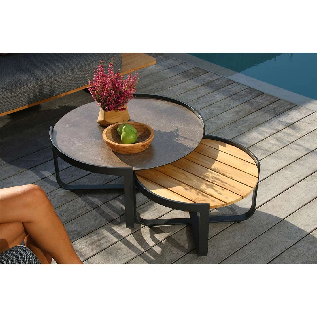 Teak ist besonders widerstandsfähig gegen Witterungseinflüsse wie Temperaturschwankungen, Nässe und Trockenheit. Kein Wunder, dass das hochwertige Hartholz als Material für die Tischplatte ausgewählt wurde.