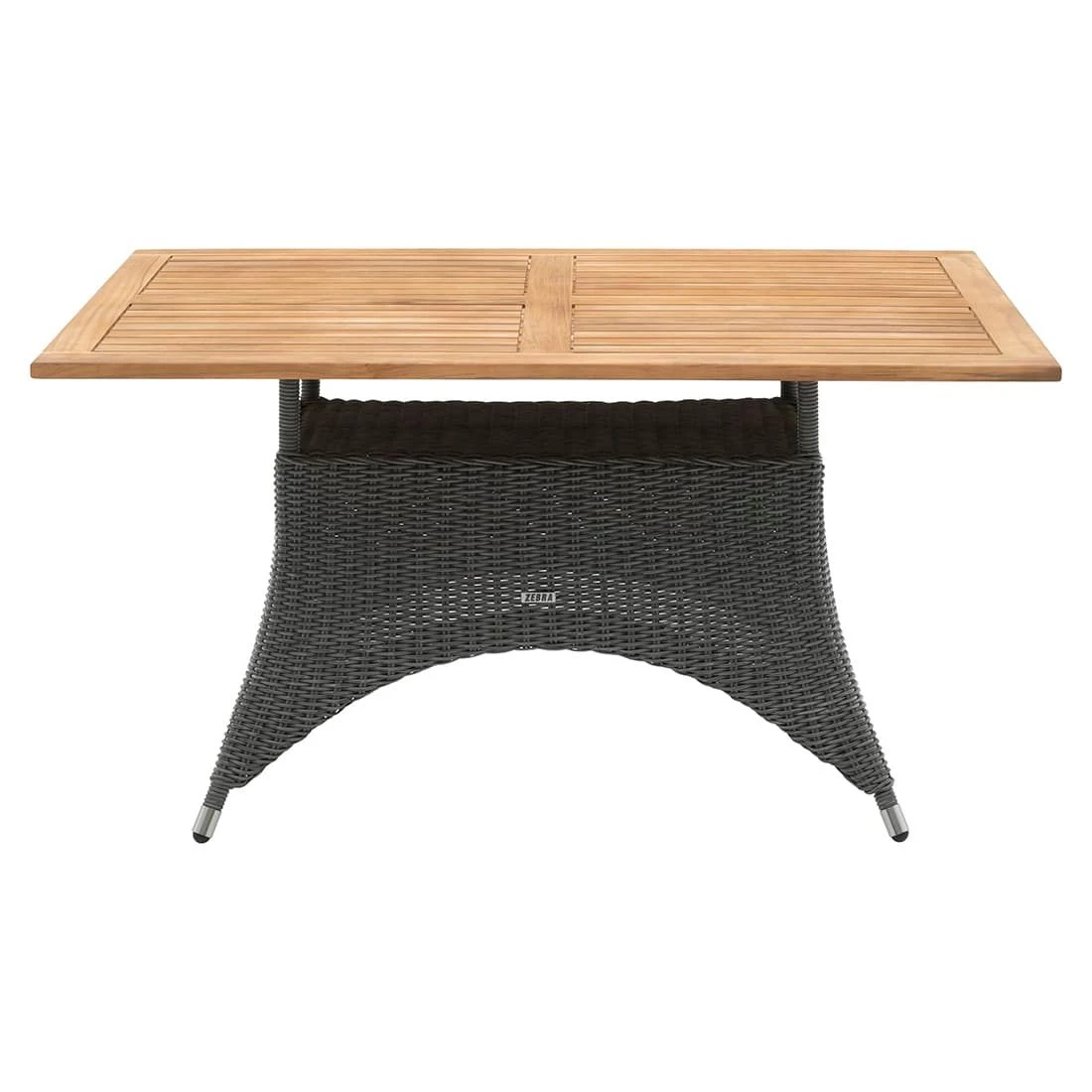 Mit seinem Gestell-Material Aluminium zählt der Gartentisch Novus zu den modernen Tischmodellen, die sich im Garten ohne Aufwand aufstellen und bewegen lassen. Teak ist enorm widerstandsfähig gegen Witterungseinflüsse wie Schwankungen der Temperatur, Nässe und Trockenheit. Kein Wunder, dass für den Gartentisch dieses hochwertige Holz als Material für die Tischplatte verarbeitet wurde. Farblich ist die Tischplatte in einem schönen Teak gehalten. Das klassische Vierfuß-Gestell garantiert Ihnen maximale Beinfreiheit. Mit der rechteckigen Form lässt sich der Gartentisch platzsparend in Ecken oder an Häuserwänden aufstellen.