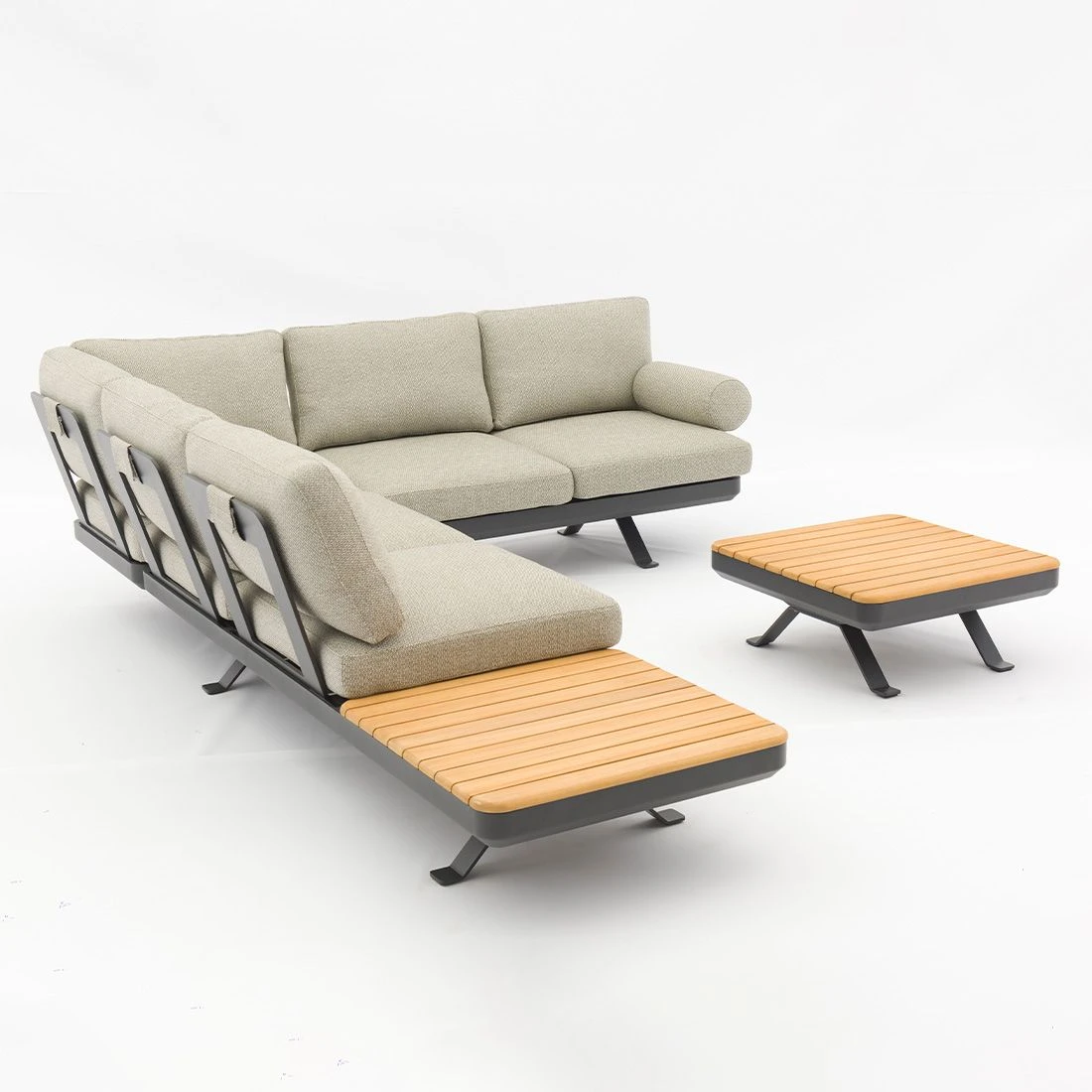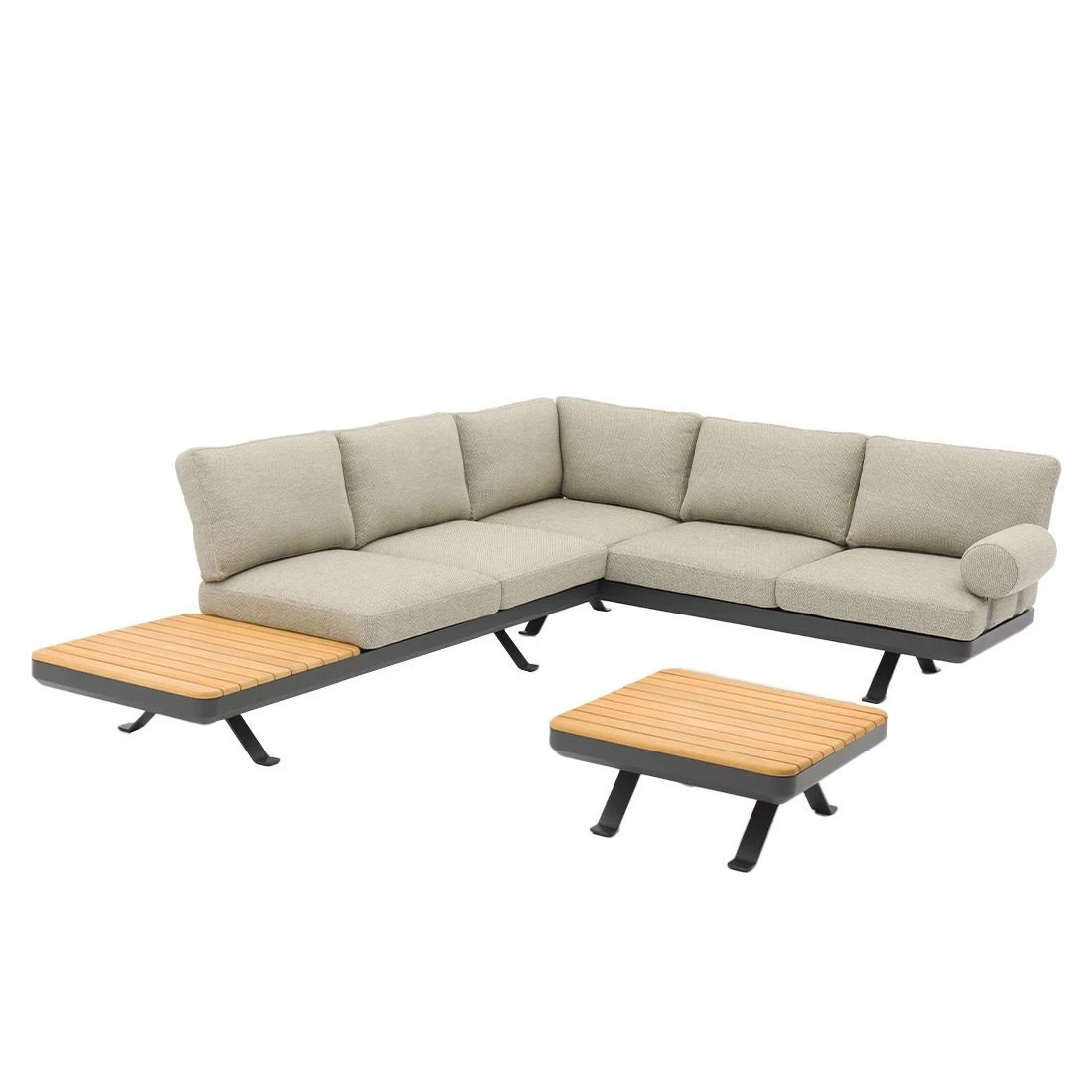 Das Gestell und die Sitzfläche sind aus Aluminium (pulverbeschichtet) gefertigt. Damit die Ecklounge optisch ansprechend ist, sind das Gestell, die Sitzfläche und die Füße im Farbton Graphit gehalten. Die Bezüge sind aus dem Marken-Outdoorstoff Olefin gefertigt. Das Material verbindet eine angenehme Stoffoberfläche mit hoher Witterungsbeständigkeit. Denn sowohl Sonne als auch Regen können dem robusten Outdoor-Stoff kaum etwas anhaben. Die Farbe des Bezugs ist Camden Grey. Teakholz ist außerordentlich widerstandsfähig gegen Witterungseinflüsse wie Schwankungen der Temperatur, Nässe und Trockenheit. Kein Wunder, dass das hochwertige Hartholz als Material für die Tischplatte verarbeitet wurde. Farblich überzeugt die Tischplatte in Natur. Stabilen Halt findet die Ecklounge auf Füßen aus Edelstahl (pulverbeschichtet).